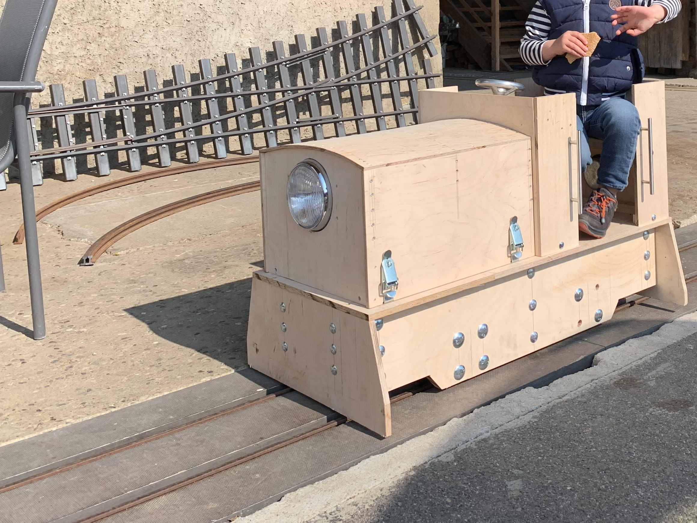 Die Lokomotive wird durch einen DC Motor 24 Volt 2500 Umdrehungen angetrieben. Ein Kettengetriebe drosselt die hohe Umdrehung und eine banale Steuerung aus dem Internet hilft den Motor über zwei 12 Volt Batterien anzutreiben.