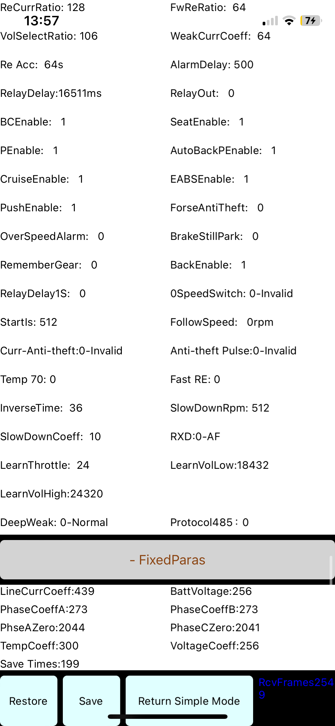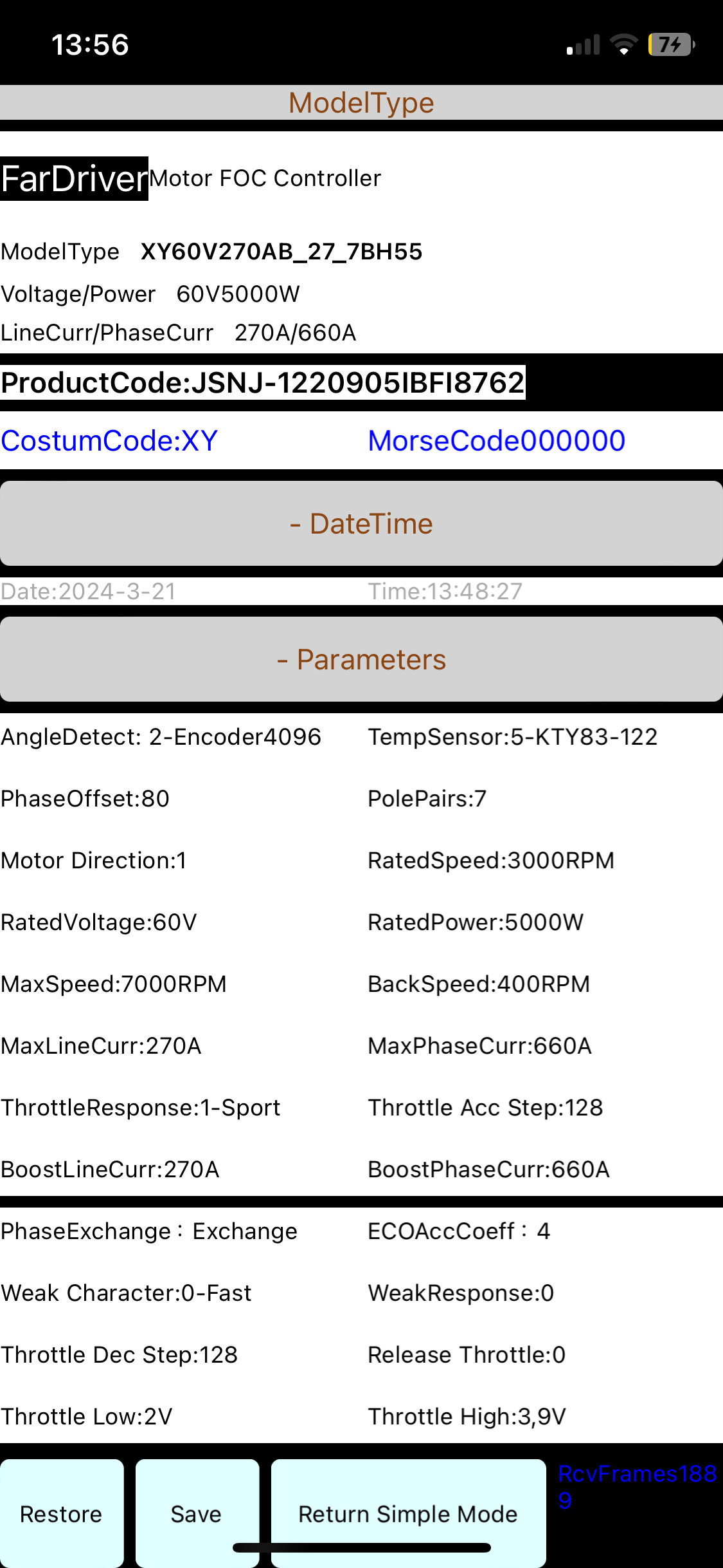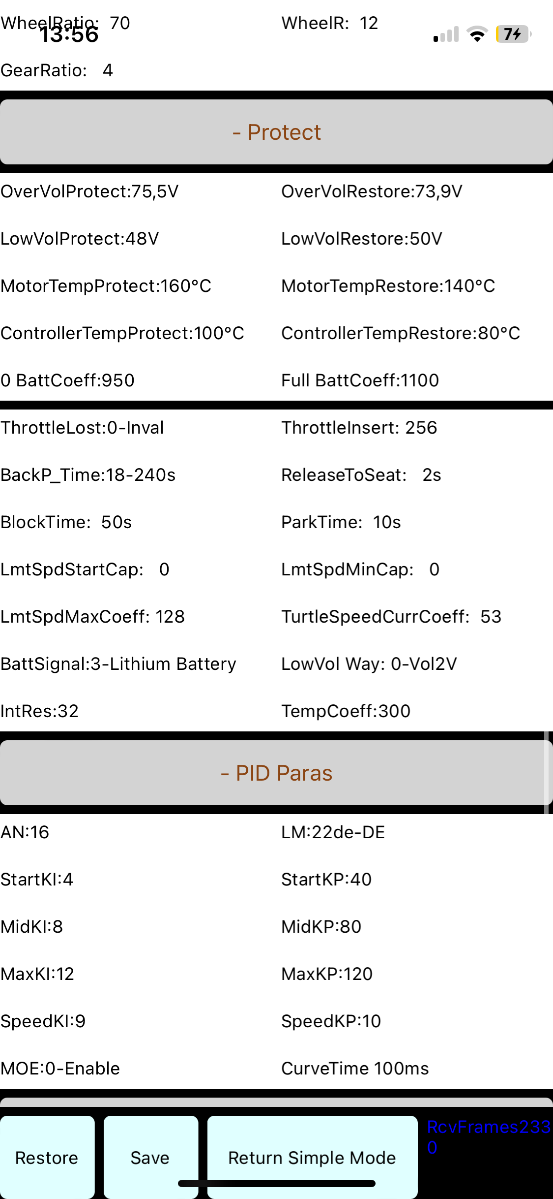 Ich bin aktuell dabei mir einen Elektro Außenbordmotor zu bauen und habe einen FarDriver ND72270 Controller und Qs165 Motor (Encoder). Ich hatte den Controller mit Motor schon ein mal laufen (nach zahlreichen Versuchen der Einrichtung des Controllers da die Autolearn Funktion nicht richtig funktionierte) aber hatte das Problem, dass der Motor nach Gas wegnahme nicht aufhörte zu drehen weshalb ich den Controller via App (in Hoffnung es funktioniert danach richtig mit der Gasabnahme) zurückgesetzt habe. Jetzt kriege ich den Controller leider nicht mehr Angelernt und er fängt höchstens an zu vibrieren oder sich mit >1 Umdrehung pro Minute zu drehen. Bitte um Hilfe.