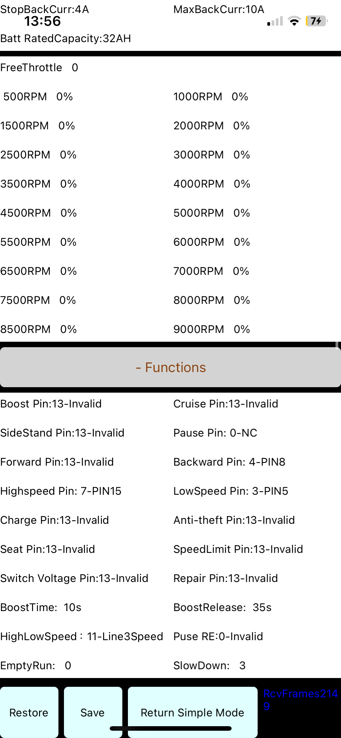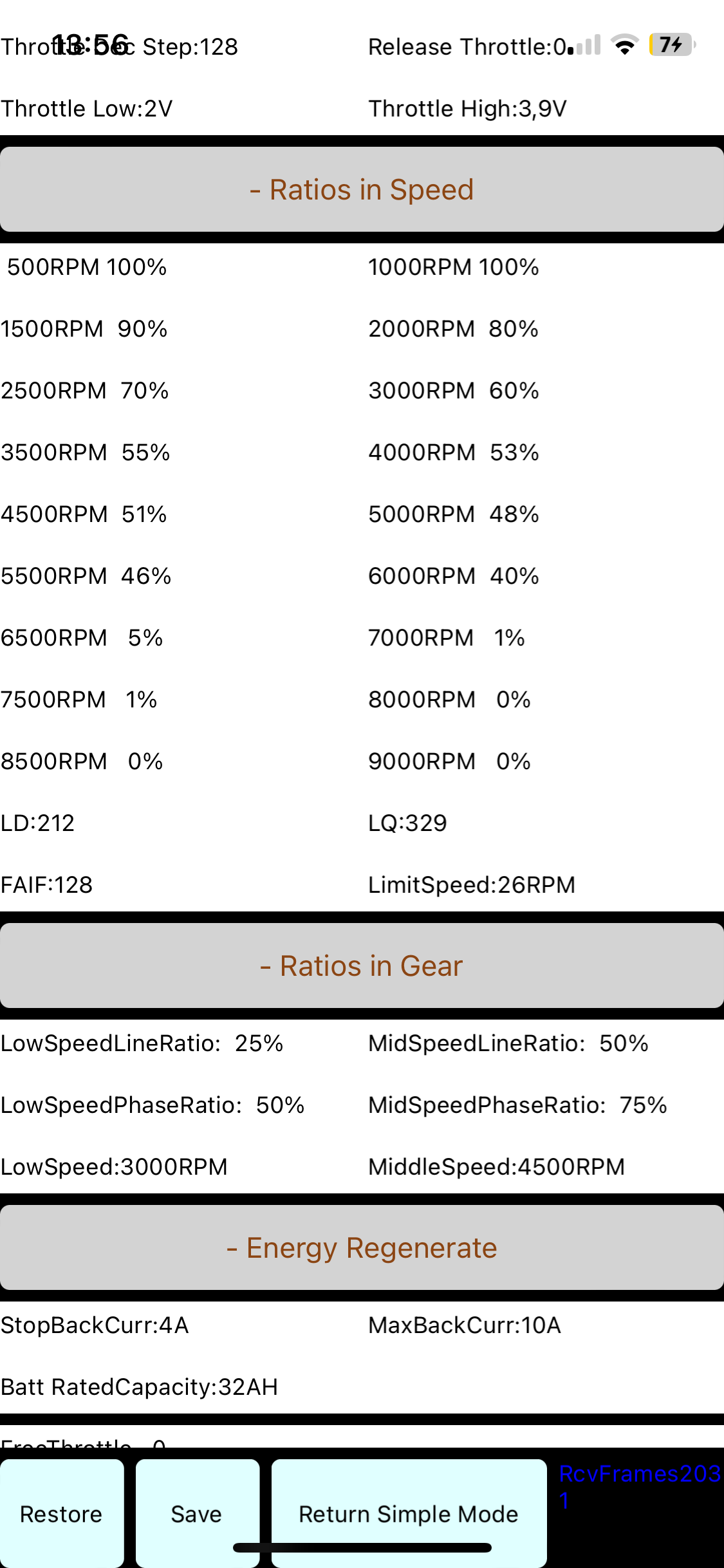 Für einen Bootsmotor mach Rekuperation aus meiner Sicht keinen Sinn. Um da störende Effekte zu vermeiden, wäre mein Rat Alles was mit Break und EABS zu tun hat, zu deaktivieren. Drehzahllimmits müssen an anderer Stelle erfolgen und oberhalb des Limits mit 0% abgefangen werden (was ja korrekt erfolgt ist). Hat die vorhandene Strombegrenzung weit unterhalb des Limits einen triftigen Grund?
