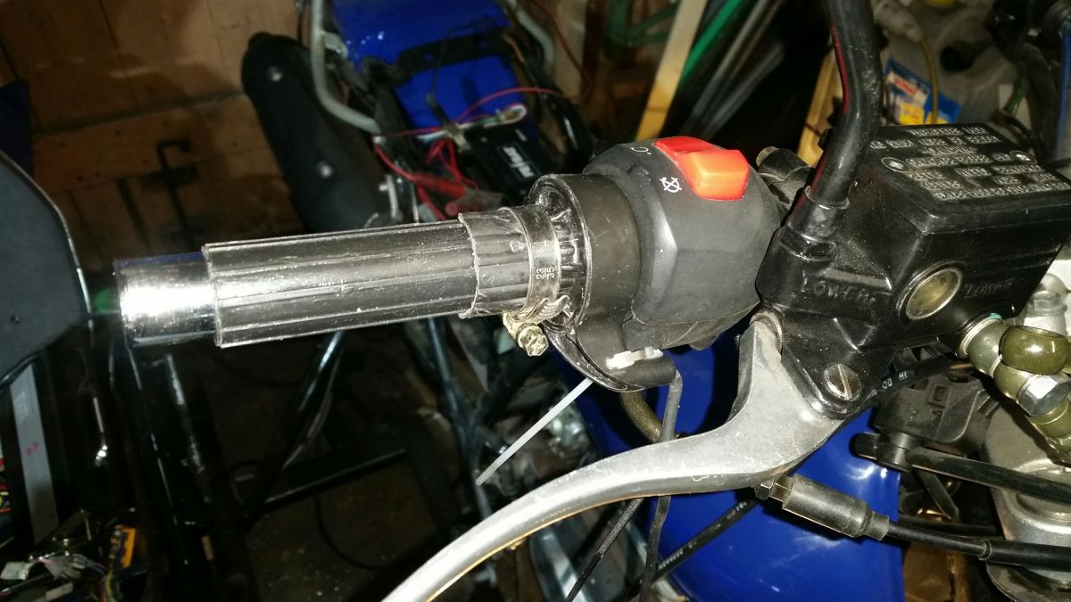 hab dann alles ausgemessen , den Halldrehgriff und den Motorradgriff dann mit Dremel, Feilen und Säge bearbeitet...um beides zusammen zu bringen und mit einem Schlauchband festgeklemmt...hat dann auch geklappt.