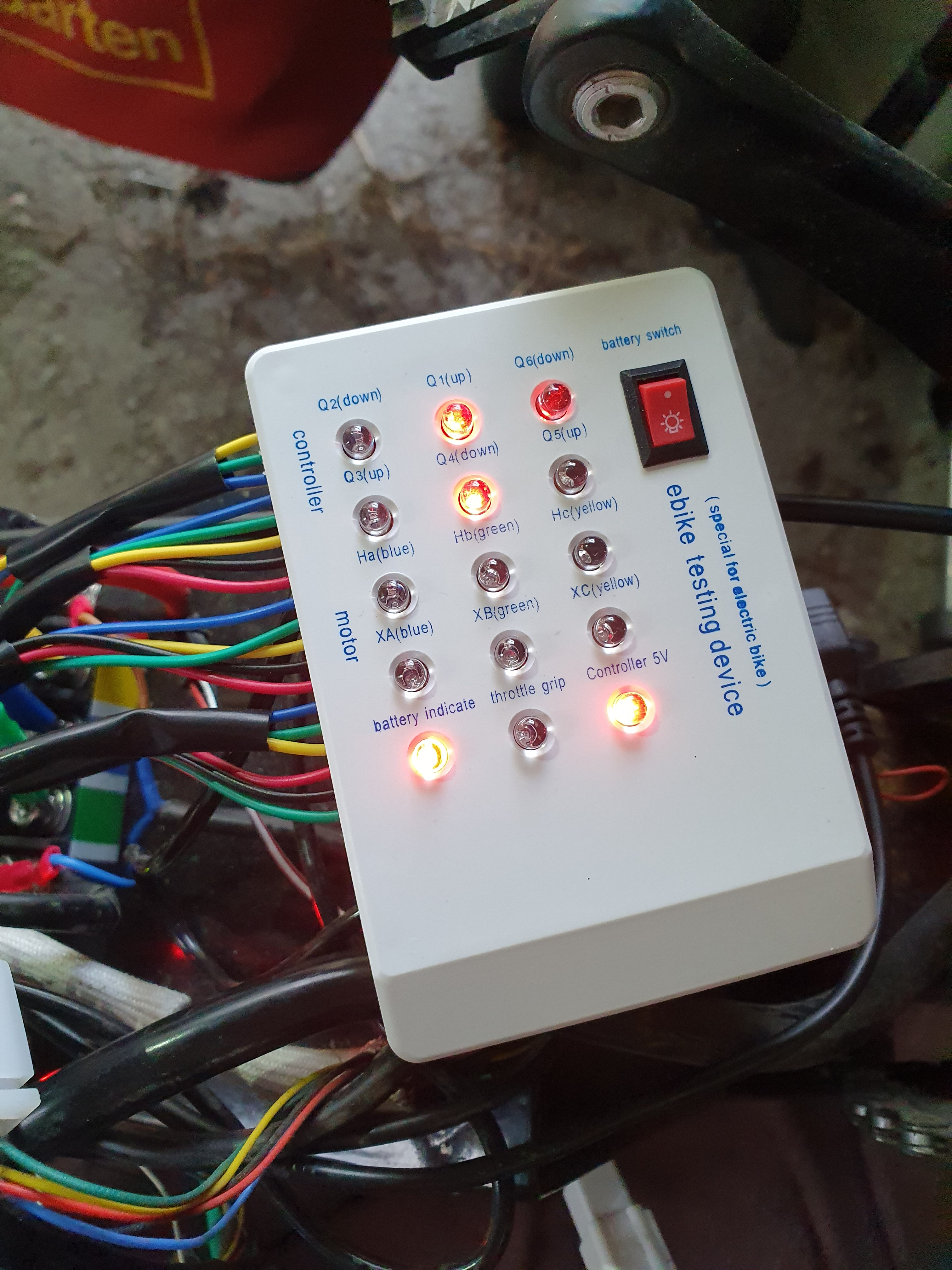 Zusätzlich leuchtet natürlich die LED Controller-5Volt permanent oder blinkt wie im Video. Das Testgerät hätte dabei die Verbindung zu den 5 Hall-Sensorkabeln des Controllers und mit blau, grün, gelb-Klemmen an den Phasenkabeln des (eingeschalteten und im Fahrmodus befindlichen) Controllers.