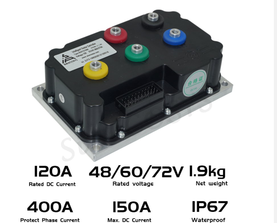Die 120A stehen für den max. Batterienennstrom - kurzzeitig auch 150A. Der Motorphasenstrom kann bei kleinen Drehzahlen den ca. 2,5 - fachen Strom annehmen. Die 400A stehen also für den max. Motorphasenstrom.