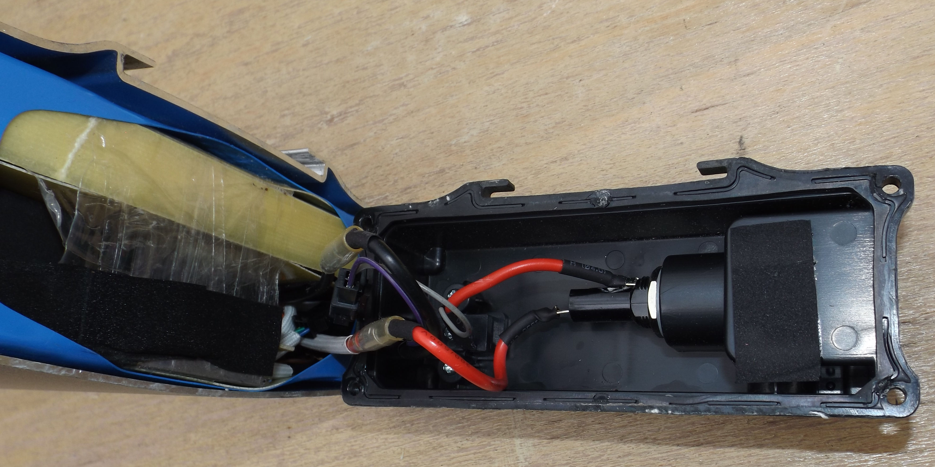 Um aber an das BMS heranzukommen, muß man vorher die beiden schwarzen Blöcke heraus haben. Weil ich nicht wußte, was für eine Elektronik in den schwarzen Dingern ist, war das ein kalkuliertes Risiko. Außerdem: der Akku war sowieso hinüber. Also mit einem Schraubenzieher so lange seitlich drücken, bis der erste schwarzen Klotz aufgibt. Dann noch den zweiten mit der Pertinax-Platine ... und dann sieht es so aus: