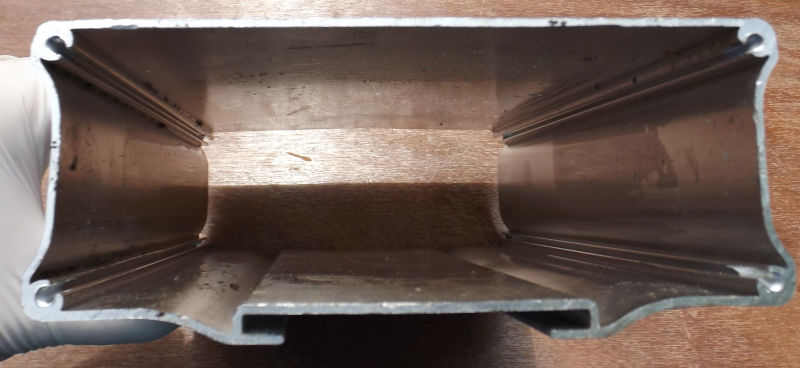 Hier erkennt man auch, warum die Aufwölbung des Aluminium-Rohrs geringer ist: Es ist nur eine Zelle! Am anderen Ende sind DREI Zellen aufgequollen.