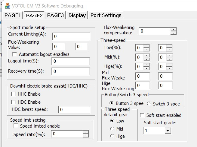 dann verate uns doch mal die Werte, die die Votol-Software nach verbindung mit dem Motor-Controller in den Feldern auf page 2 ausgibt? Um genau zu sein, geht es um die Werte der linken Seitenhälte unten bei Downhill und bei Speed Limit, sowie um die rechte Hälfte der page 2, allerdings nur die linke Spalte oben bei Three Speed-Prozente Low, Mid und Hige (Die linke Spalte ist für Normal-Spannung und die single voltage operation)