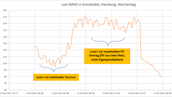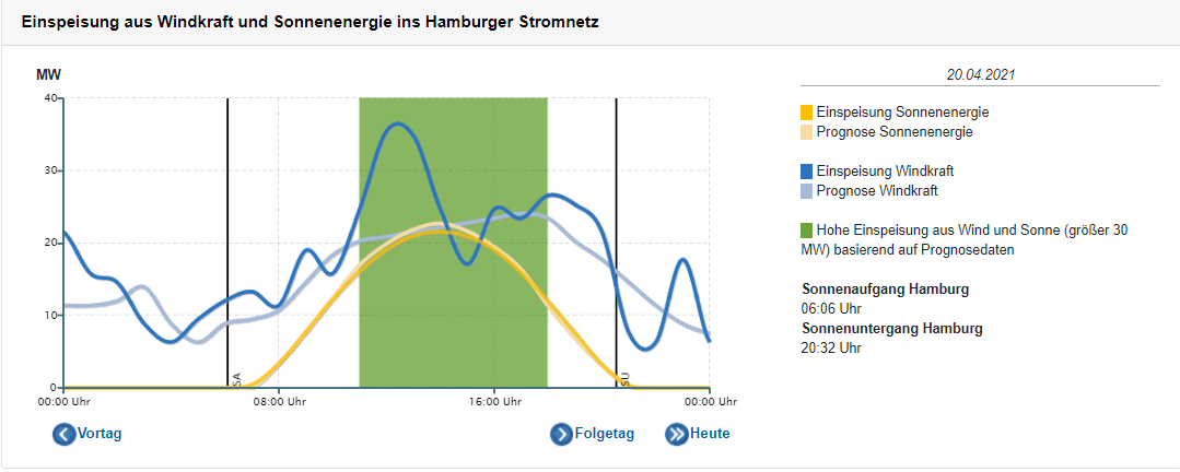 Also, unsere lokalen Daten hier in Hamburg sind gut gepflegt. Das ist das Stromwetter in Hamburg von 20.04.2021 (schöner, sonniger, aber kühler Tag im April):