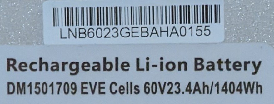 Foto von der Etikette des Akkus (60V 23.4Ah Eve Cells)