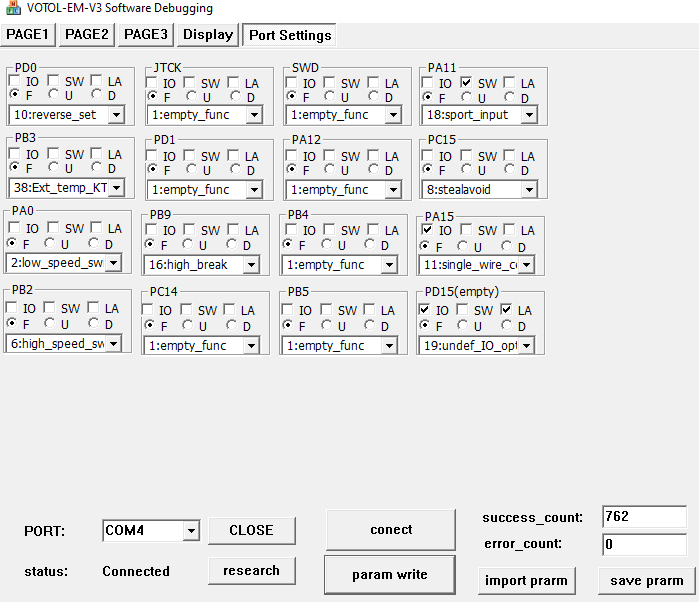 Richtig, der Kommunikationsport zum Tachodisplay (Umschaltbar LIN-Protokoll / Hall-Simulation) liegt natürlich auch an fester Stelle (bei mir PB9) nur eben beim EM150SP mit anderem Stecker anders, als beim EM200SP (der meiner Anleitung aber nicht beschrieben ist) wo es wohl PA15 ist.