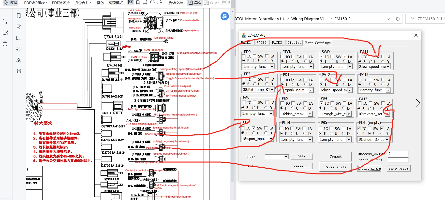 Eventuell musst du ein Wenig experimentieren: Nacheinander den Ports z.B. die Funktion "28:low_brake" zuordnen und dann die Anschlüsse durchklingeln, wann er auf der Display-Seite "Brake" oder chinenglish "break" anzeigt, wenn du den Anschluss auf 0V ziehst.