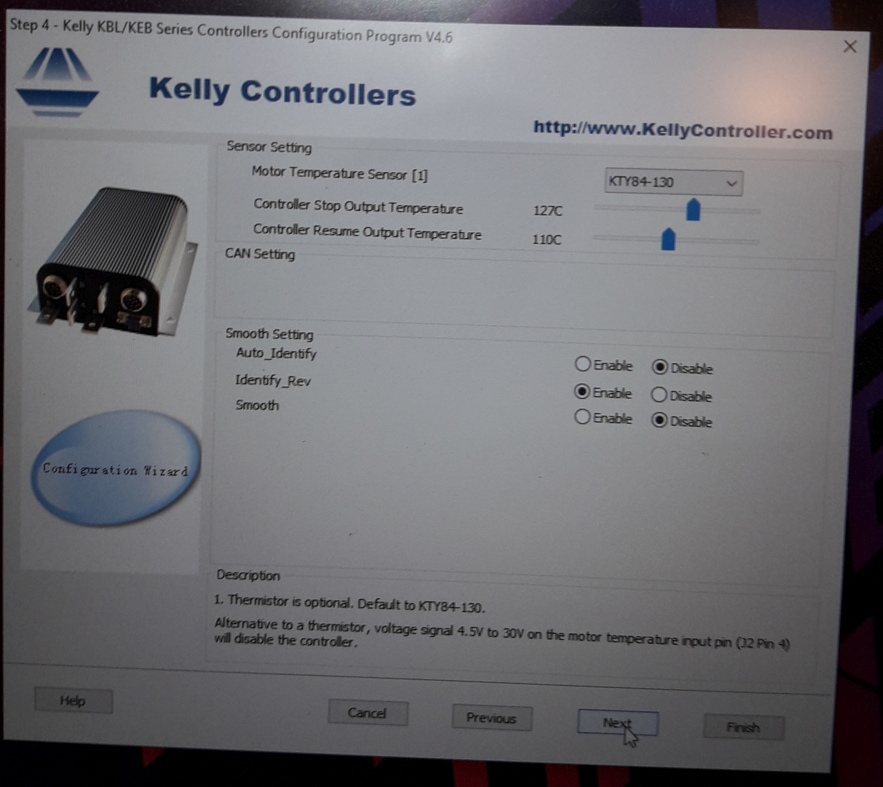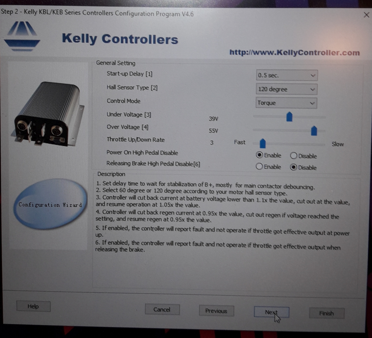 Die Software Version ist die 406 für KEB, anbei Bilder. Sehr ungewöhnlich finde ich, dass die Polpaare auf Seite 3 falsch eingestellt und ausgegraut sind. Aber Kelly sagt, die werden nur zur Drehzahlermittlung mit CAN Modellen benutzt und man soll sich keinen Kopf machen. Auf Seite 4 ist dann unten "Smooth". Rev check habe ich noch nicht verstanden, Auto identify wenn man das aktiviert taktet er alle drei Phasen beim Start durch. Bei mir hat er immer rot angezeigt und scheint nicht glücklich, jemand anders aus dem Internet hatte immer grün und war auch nicht zufrieden.
