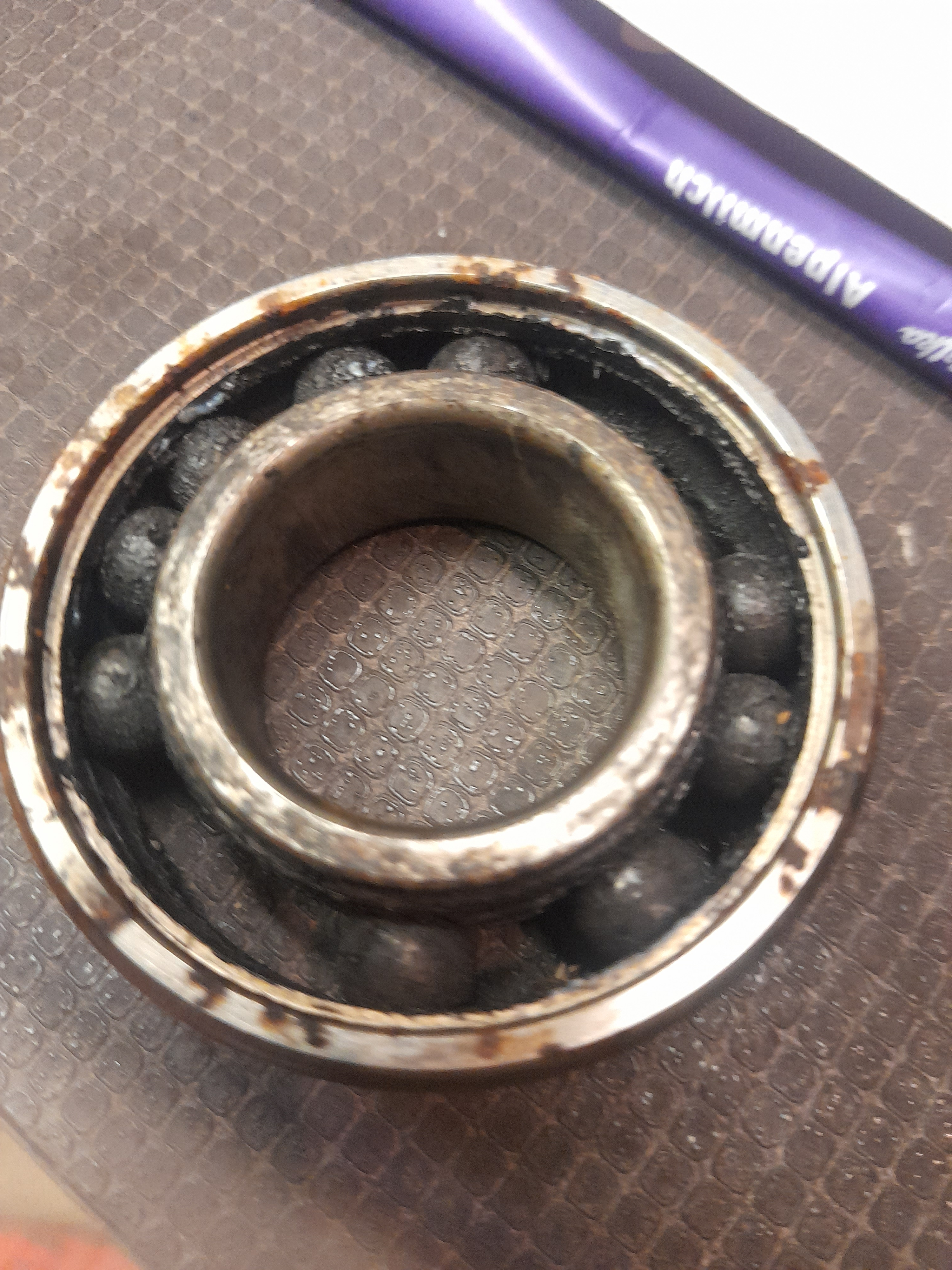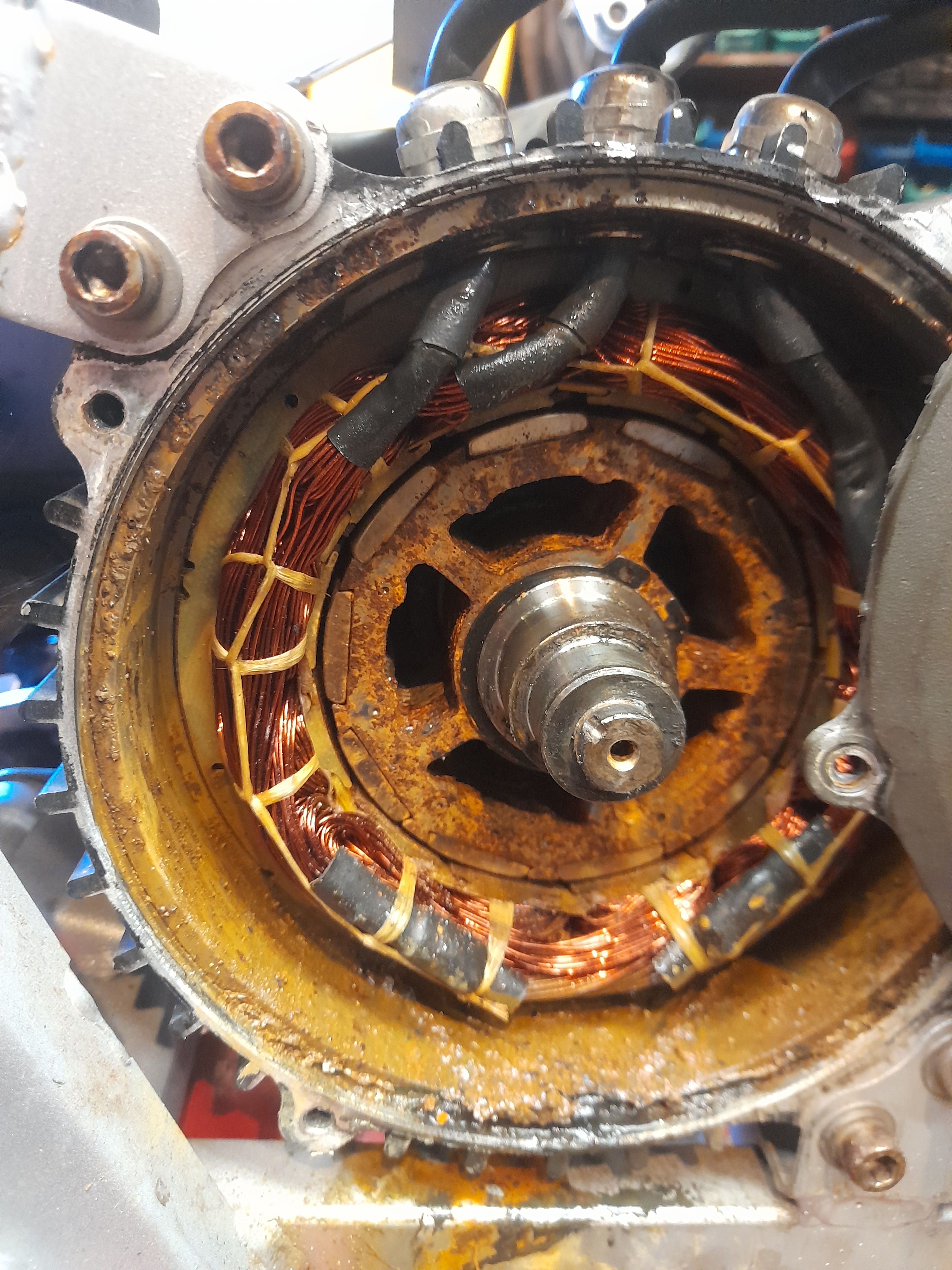 Beim Öffnen vom kleinen Seitendeckel kam mir schon eine braune Suppe entgegen. Dann hab ich den Motor zerlegt. Insgesamt war ein dreiviertel Liter Wasser im Motor. Der völlig verrostet. Das hallgeberseitige, rechte Lager hatte den Käfig abgeworfen und die Kugeln waren komplett verrostet. Der Ringmagnet auf dem Motortapfen der den Hallgeber steuert war unterrostet und leider an einer Stelle gesprengt.
