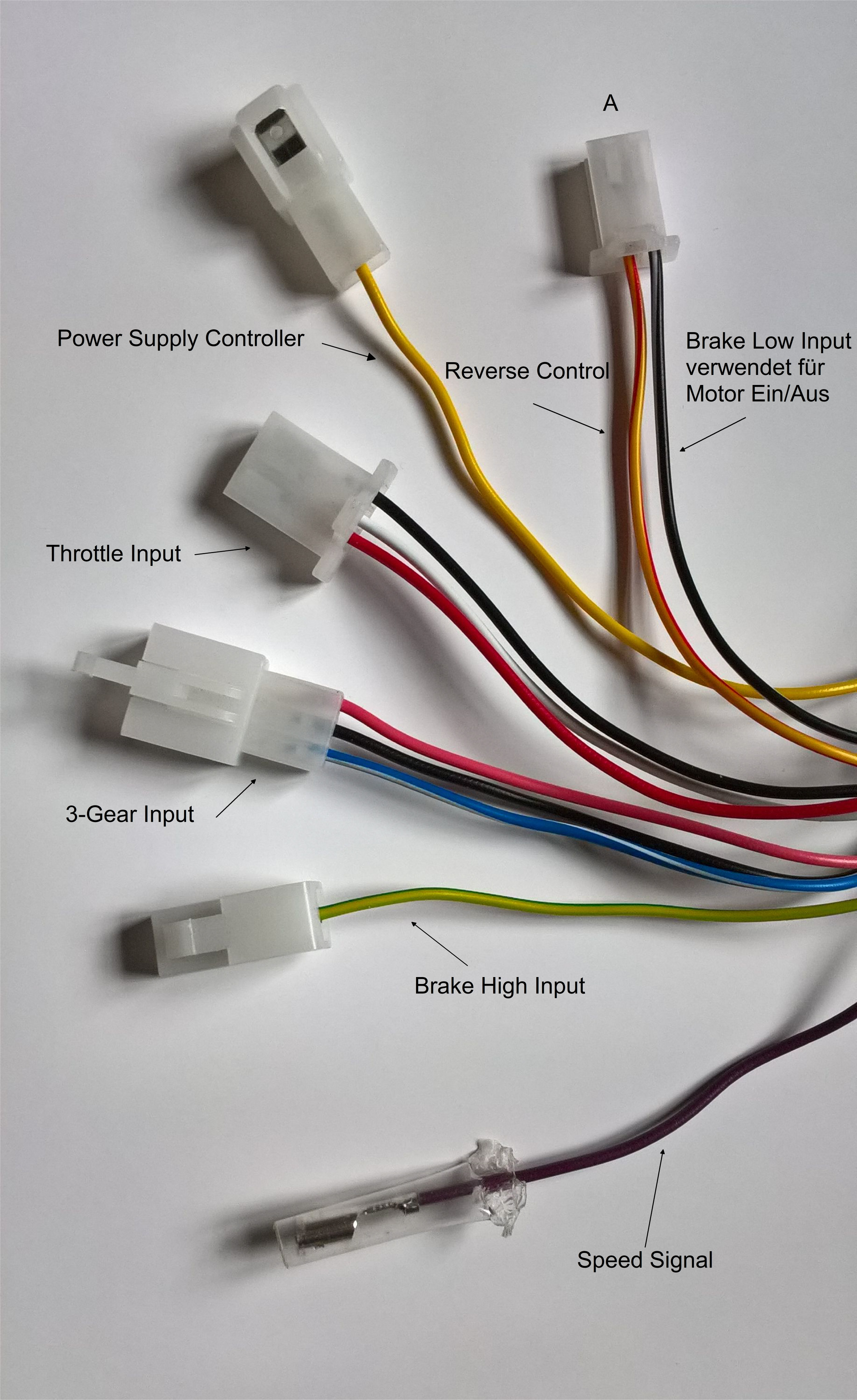 Welche Spannungspegel die beiden "Gangstufen" Kabel haben, weiß ich nicht und ich denke braucht man auch nicht zu wissen, da man ohne die entsprechenden Anschlüsse aus dem Controller die Fahrmodi ohnehin nicht schalten kann. Also muss man ermitteln, ob der Controller die entsprechenden Anschlusskabel hat und welche das sind.