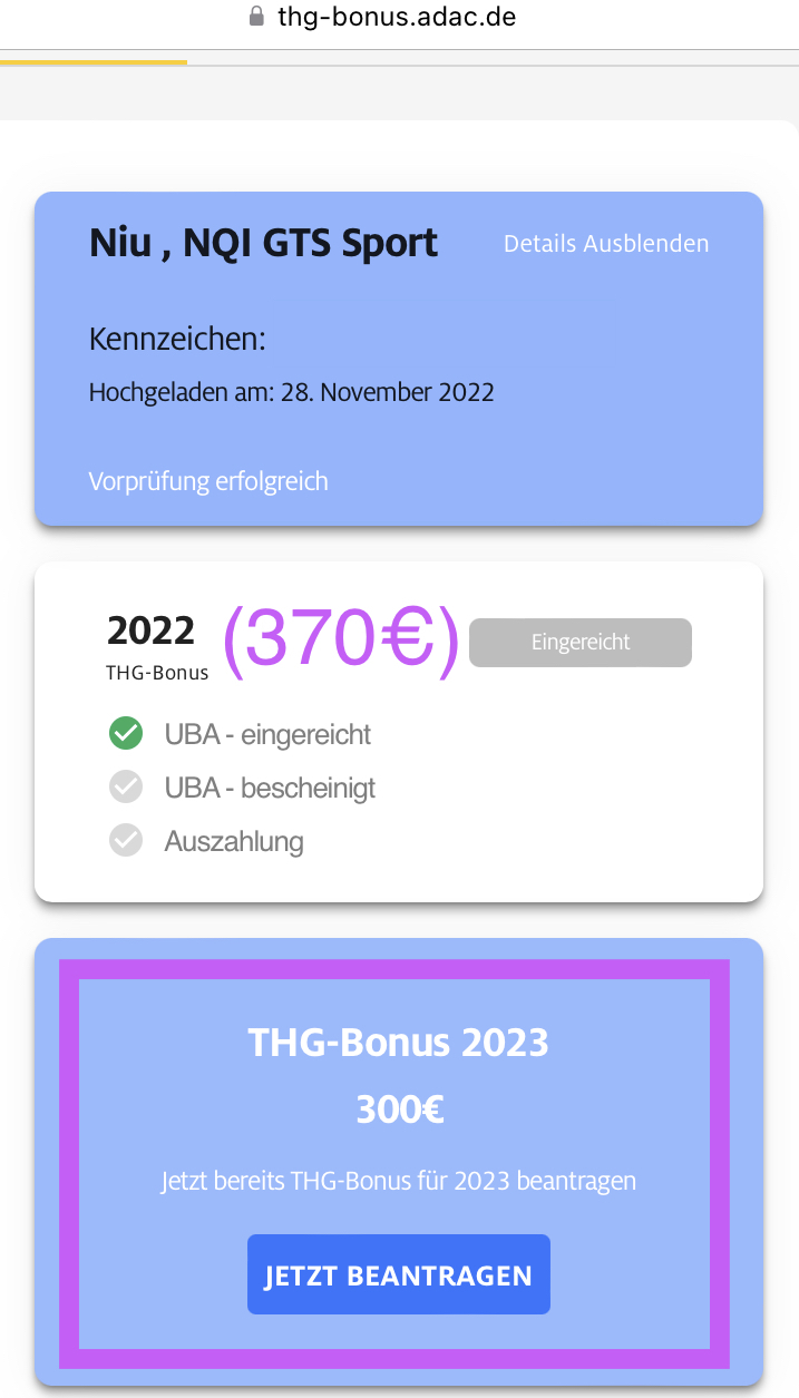 Also ich war mit Geld für eAuto super zufrieden. Die garantieren 400 Euro für 2022 und ging recht schnell (ziemlich genau 3 Monate bis Auszahlung, was bei der aktuellen Bearbeitungszeit vom UBA top ist). Solange du vor dem 31.12. die Papiere hochlädst, sollte das auch kein Problem sein. Nur haben die eine Klausel drin, dass man auch für 2023 bei denen bleiben muss, wenn man nicht widerspricht (das ging aber per Mail super einfach, muss man nur wissen).greifswald hat geschrieben: ↑Di 20. Dez 2022, 15:56Nachdem Instadrive wohl etwas heikel war und ich überraschenderweise heute die Papiere zu meiner 125er bekommen habe: Welcher Anbieter ist zu empfehlen, insbesondere welcher meldet noch rechtzeitig die Quote für dieses Jahr an?
