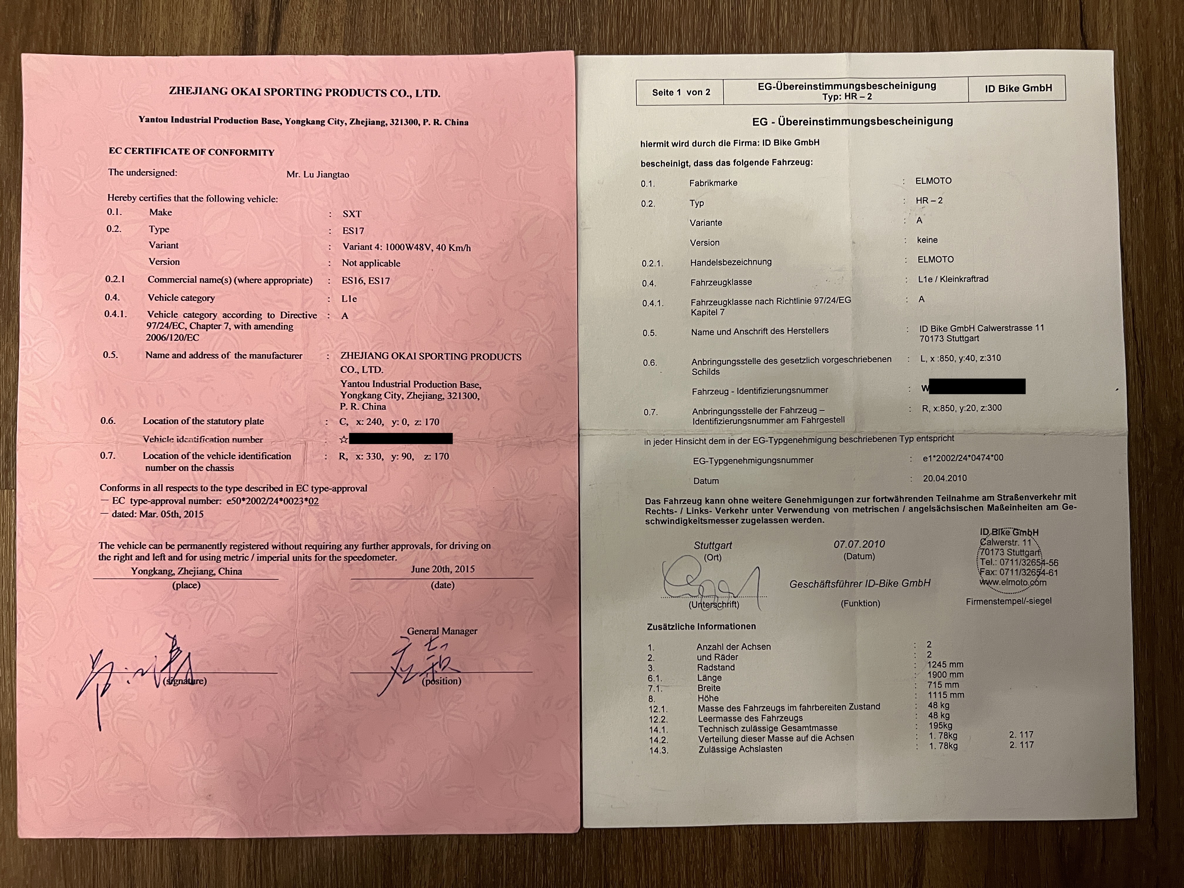 Es sind jedenfalls beides Kleinkrafträder. Und keine Pedelecs oder was auch immer. Das sagen beide COC aus. Und damit nach derzeitige Rechtslage lassen sich die freiwillig zulassen.