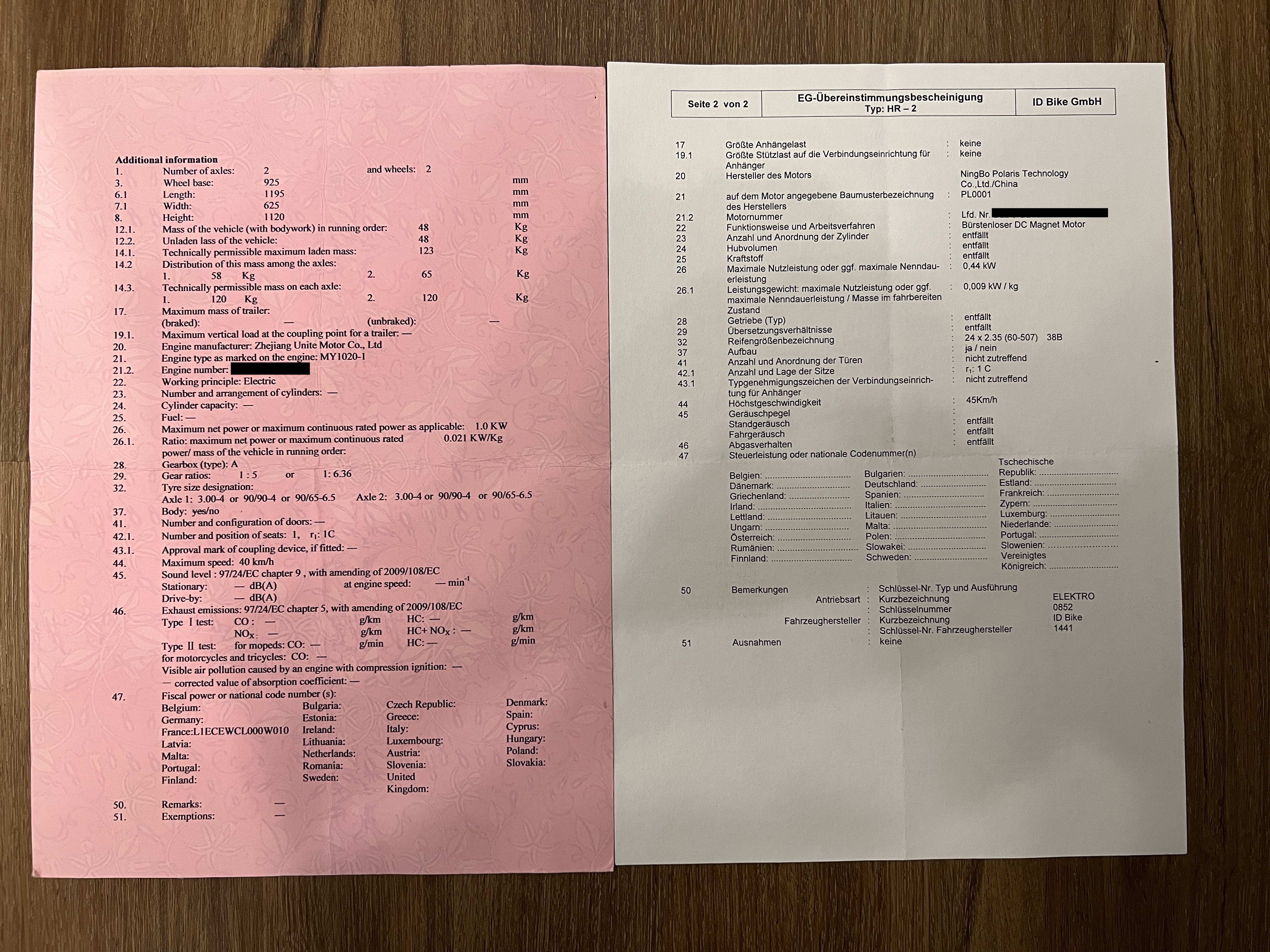 Das COC ist doch ausreichend. Fahrzeugklasse ist L1e (siehe Punkt 0.4). Mag ja sein, dass sich die L1e unterteilt in L1e-A (Pedelecs) und L1e-B (Kleinkraftrad).Alexthebest hat geschrieben: ↑Di 8. Nov 2022, 20:55Und was denkst du, was das nun heißt? Wie soll ich beweisen, dass der HR-2 mehr als 1000 Watt hat? (Hab ja als "Beweis" nur das COC).