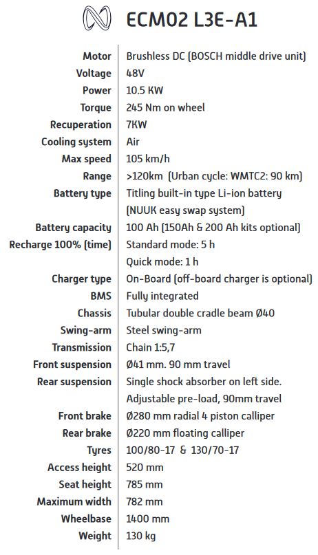 Die Fahrzeuge (mit einem Gewicht zwischen 115 und 130 kg) sind mit einer Kapazität von bis zu vier Batterien von 50 A ausgestattet und verfügen somit über eine Reichweite von mehr als 300 km. Ihre Aufladung hat zwei Möglichkeiten: normales Laden und Schnellladen (QuickMode), kann in seiner Version von 10,5 KW eine Höchstgeschwindigkeit von 100 km / h erreichen, das System der Dämpfung hat eine umgedrehte Gabel und montiert Räder mit 17er Felgen Zoll