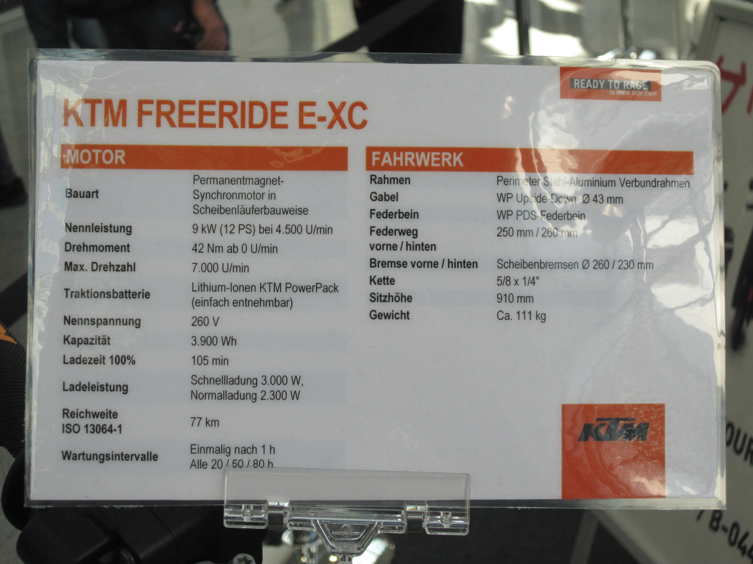 KTM Freeride E-XC (im Boulevard), endlich ist die Frage nach der Reichweite geklärt - nach ISO 13064-1 77km (wurde irgenwo im Forum gefragt, ich muß den Thread nochmal suchen):