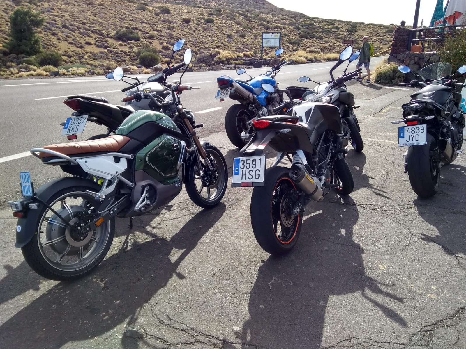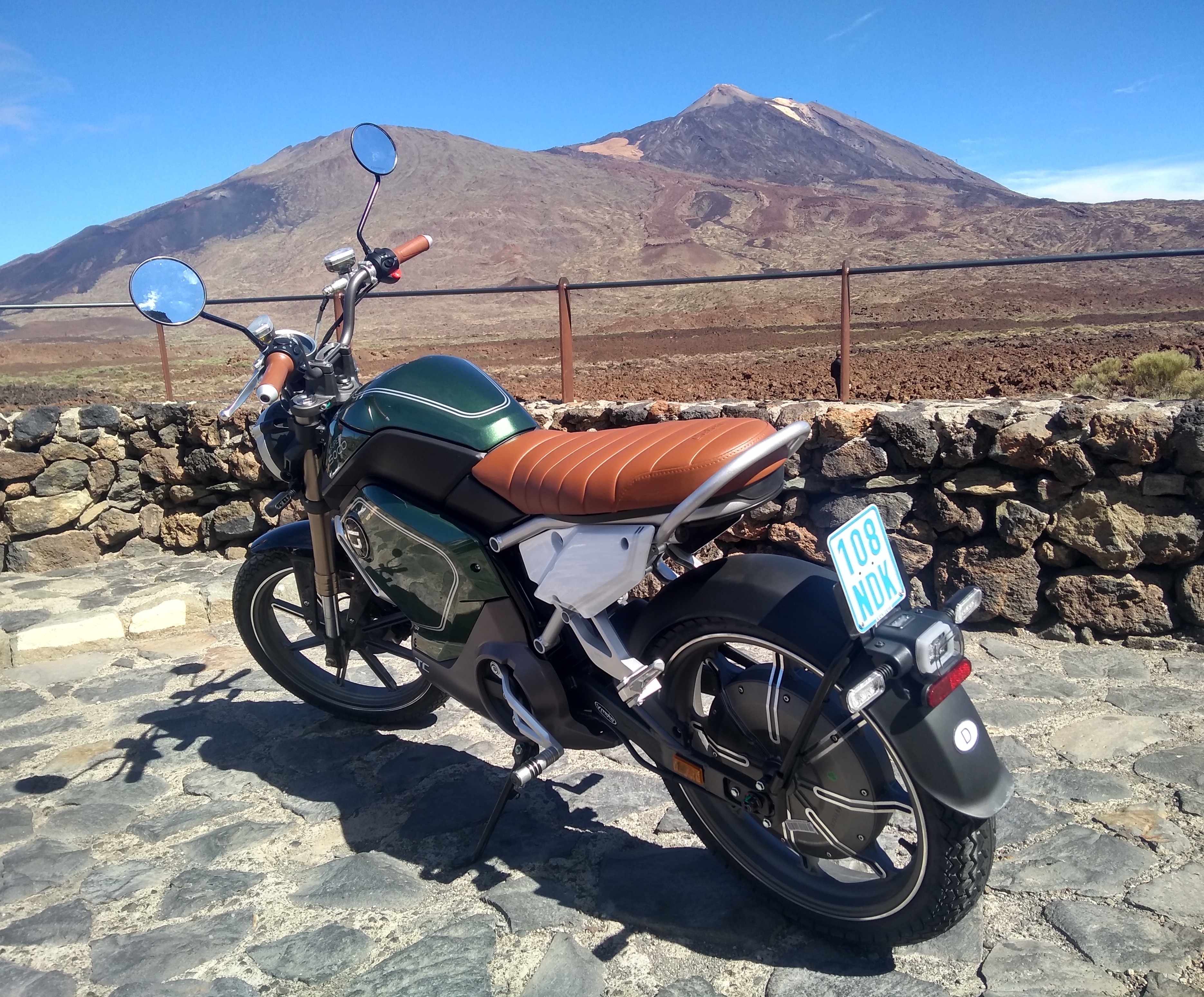 Das Begleitfahrzeug (Audi TT 1.8) hat für dieselbe Strecke über den Teide 10,1 Liter Superbenzin benötigt (immer mit 45 kmh vor der Supersoco voraus). Das sind etwa 100 kWh Energie.