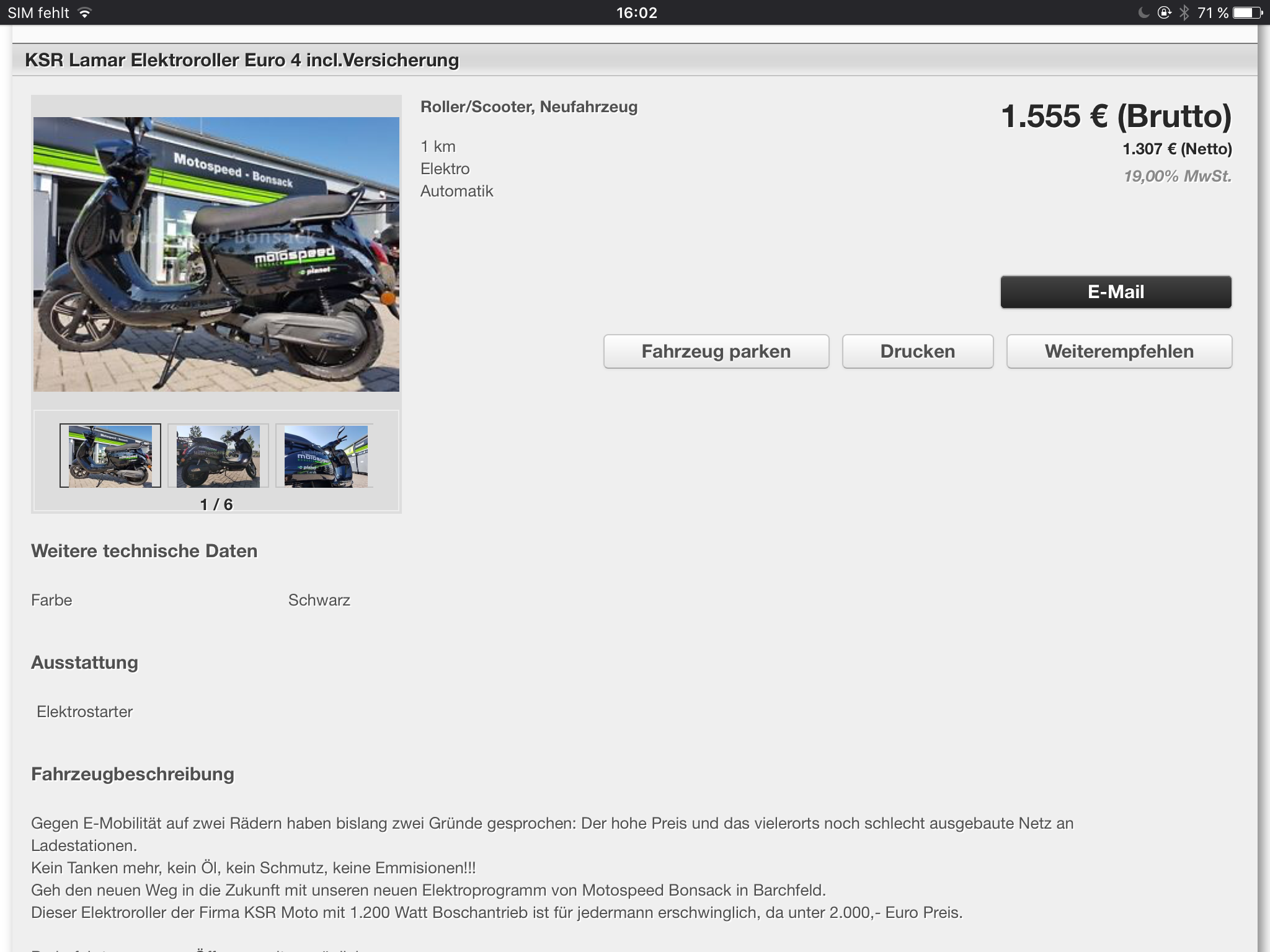 Tja, was kümmert mich mein Geschwätz von gestern... wenn man sich selbst nicht an sein Wort hält, warum sollten die Anderen dies tun? Der Onlinehandel hat die Menschen irgendwie krank gemacht. Es scheint der Glaube vorzuliegen, wenn eine Ware auf Lager ist, muss die noch am selben Tag verschickt werden um dann am nächsten, aber spätestens am übernächsten Tag beim verwöhnten Kunden zu sein. Von allen, die da nicht mitspielen, weil das Kaufobjekt Motorroller nun mal nicht im A4-Umschlag verschickt werden kann, fühlt sich der potentielle Kunde dann versetzt.zweisonnen hat geschrieben: ↑Fr 26. Okt 2018, 20:16Ich warte bis Mo zwecks Kaufabwicklung, wenn Sich nix tut, muss ich mir nen anderen Händler suchen.