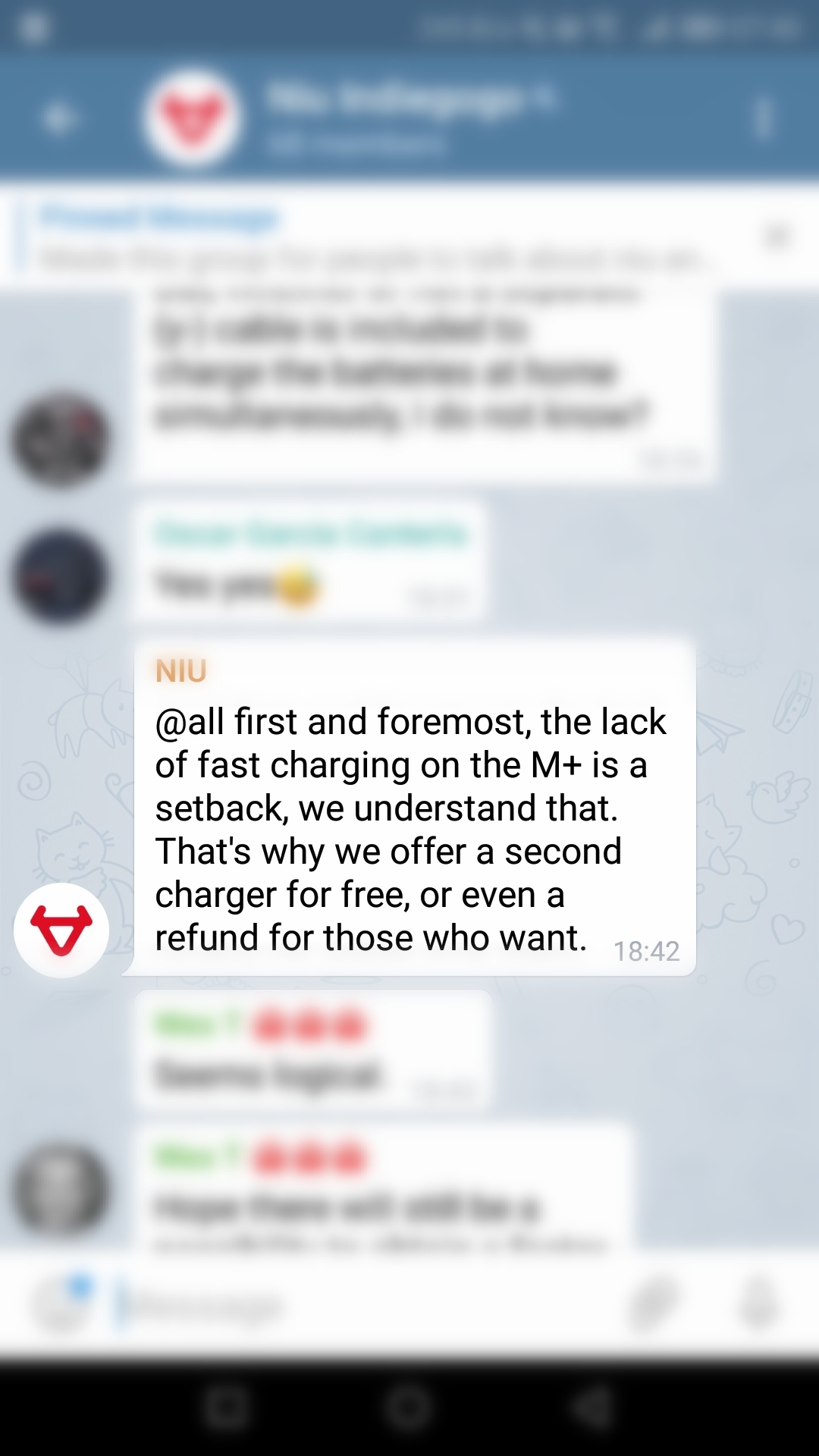 Danke fürs Teilen...denn solche Gruppen sind mir auch immer zu anstrengend.FinnCologne hat geschrieben: ↑Sa 12. Jan 2019, 07:43Offizielles Statement von Niu in der telegram Gruppe ist, dass der M+ keine Schnellladefunktion hat, als Kompensation, damit man auf der Arbeit und zu Hause laden kann, gibt es nun 2 Ladegeräte. Ladedauer wird bei ca 7h liegen. Es werden zur Zeit Nachrichten in den verschiedenen Sprachen rausgeschickt. IMG_20190112_074138.jpgkabee hat geschrieben: ↑Fr 11. Jan 2019, 20:08Alles Spekulation, es weiß niemand etwas - wie denn auch? 2. Ladegerät macht keinen Sinn. Im Gift Package ist ein Posten „ Ladegerät“. Ich stelle mal die steile These auf, dass das das Schnellladegerät ist. Mangels Zuordnung der Artikelnummern kann ich das aber nicht verifizieren, weil das Zubehör bei KSR nich nicht vollständig eingepflegt ist.