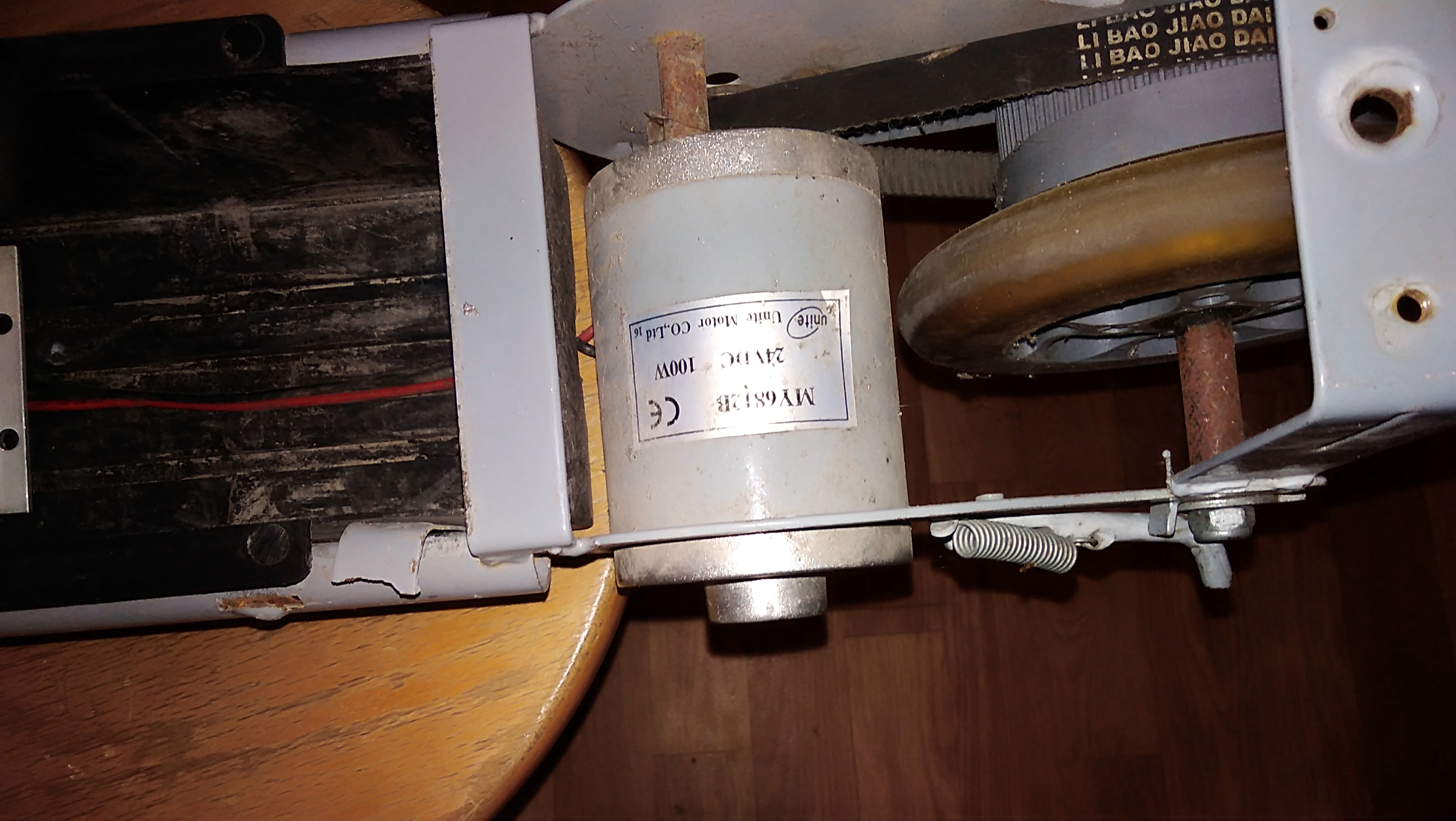 Auf dem Motor steht 24 Volt, also gehören da 2 Akkus mit je 12V rein. Vermutlich 7,5 Ah. Da musst du mal die Platzverhältnisse checken. Viel darfst du von dem 100W Motörchen aber nicht erwarten. Bergauf geht da nix.