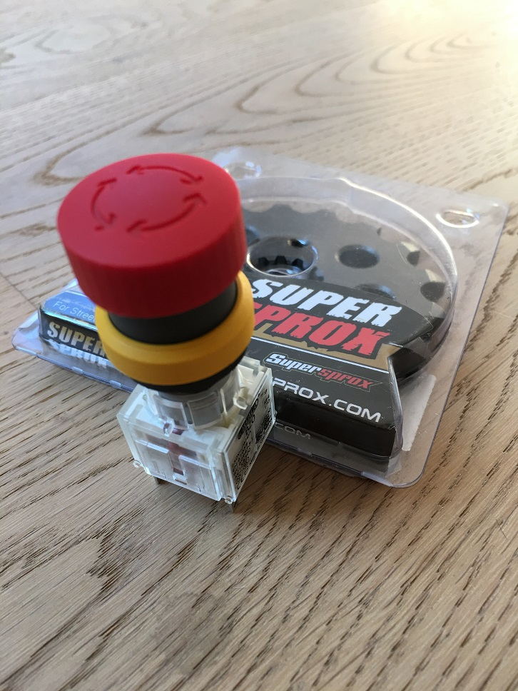 Da der neue Regler einen Notaus-Kreis hat, der das integrierte Lesitungsschütz auslöst und den Akku vom Regler trennt habe ich mir schon mal einen separaten Not-Aus-Schalter furs Cockpit besorgt. Ein seperater Kill-Switch wird ebenfalls noch folgen (Vorgabe für Bikes, die schneller als 10 Sekunden auf der 1/4 Meile sind und da hoffe ich doch hinzukommen!