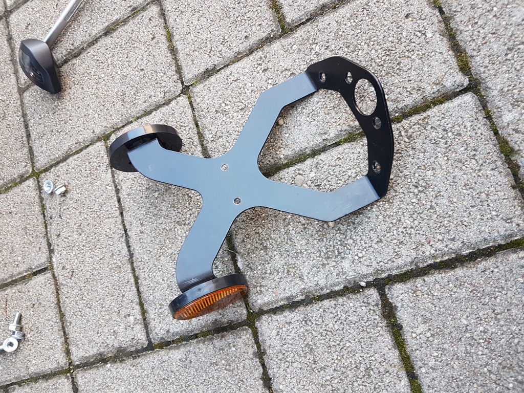 Hier meine Modifikation (Wagerechtes Teil oben + Reflektoren abmontieren, Kreuzblech oben 2 mal umbiegen, Löcher bohren für die Reflektoren und für das Nummernschild, fertig):