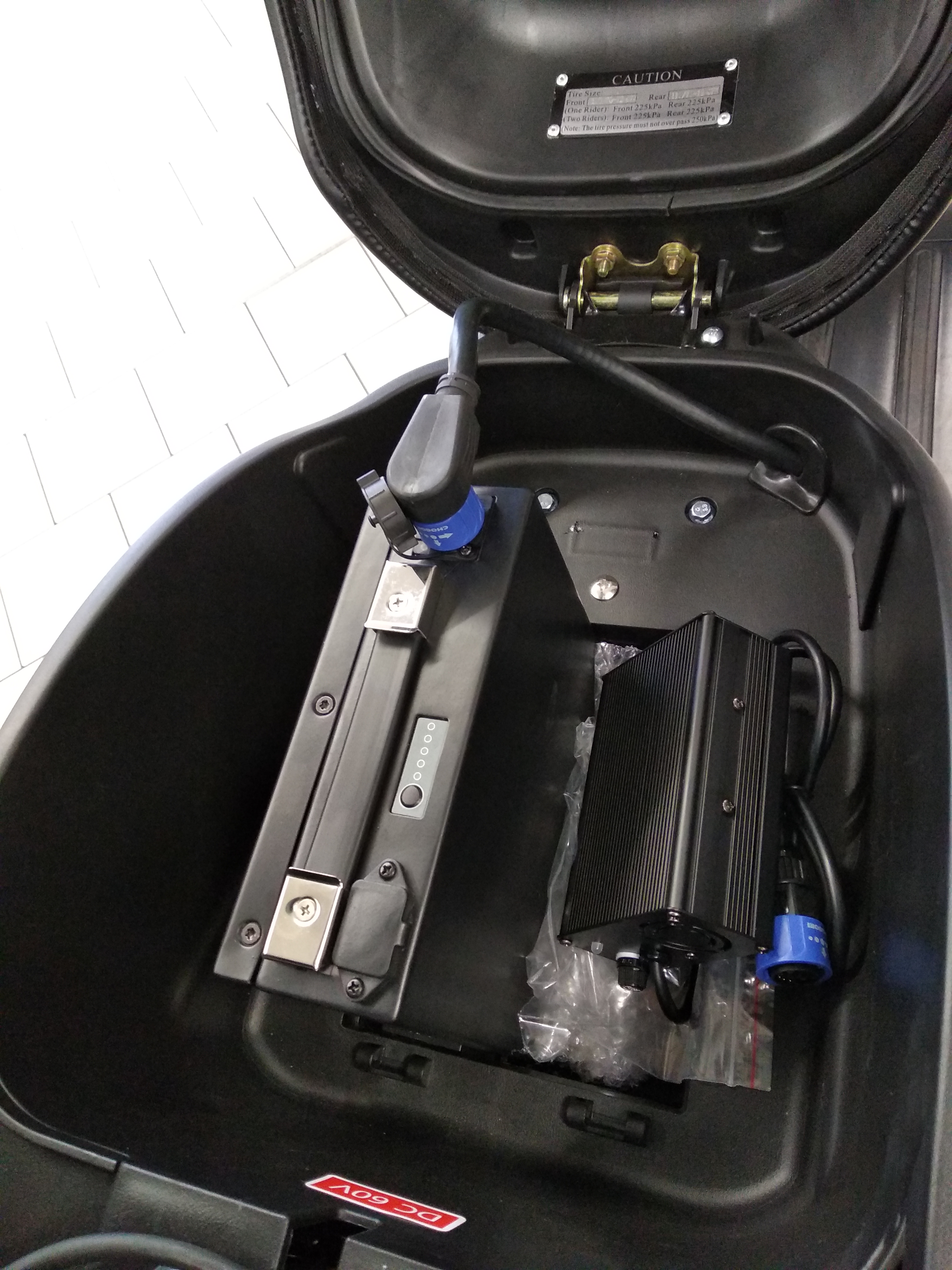 Die maximale Reichweite mit der neuen Flachen Batterie beträgt ca. 44km. (Strecke über Land, Berg auf, Berg ab, und natürlich vollgas.) Mein Gewicht liegt bei so um 93Kg. In der CERTIFICATE OF CONFORMITY hat sich auch einiges geändert -- oder sagen wir es wurde einiges berichtigt. Das Ladegerät ist eigentlich gleich geblieben. 67.2V 4A Jetzt wird nur noch über den CHOGORI - Stecker geladen. Der Ladestecker am Roller hat sich somit auch geändert. Das alte Modell ist an der Ampel besser weggegangen. Die Reichweiten allerdings waren nur bei 37 Km. Die Einstellungen am Kontroller haben sich sicher geändert. Werde in den nächsten Tagen mal unter den Sitz schauen um zu sehen was sich da so geändert hat.