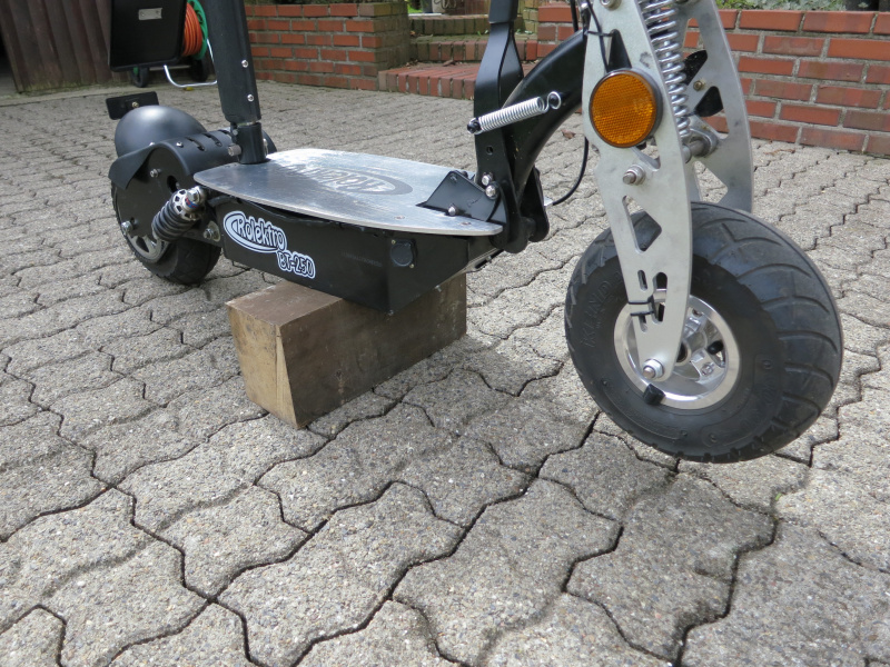 Als erstes sollte man sich einen Holzklotz beschaffen, um den eScooter aufzubocken. Beide Räder sollten frei beweglich sein.