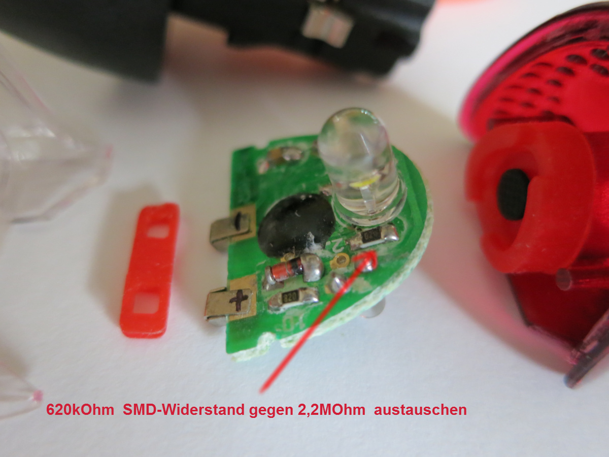 Das Bauteil, mit dem die Blinkgeschwindigkeit eingestellt wird, konnte ich inzwischen identifizieren. Es ist ein SMD-Widerstand mit 620 kΩ. Durch ausprobieren habe ich ermittelt, dass mit 2,2 MΩ die in der StVZO § 53a vorgeschrieben Frequenz von 1,5 ± 0,5 Hz für Blinklichter erreicht wird. Bei mir sind es jetzt 1,45 Hz.