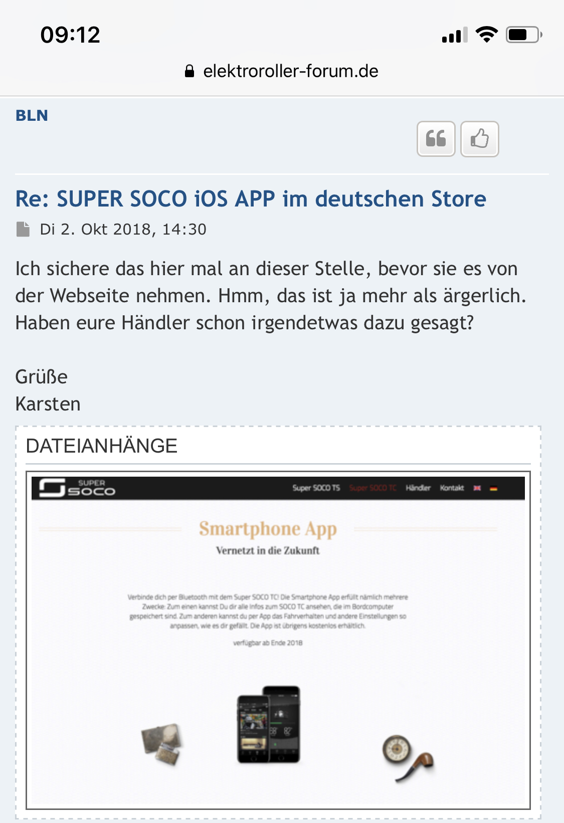 Als die App im Herbst 2018 zur Verfügung stand, stellten die Besitzer der Super Soco fest, dass die Verbindung trotzdem nicht möglich ist. Die Ursachenforschung ließ die Vermutung zu, dass das Hardware-Modul fehlen würde, und das OBWOHL in den Prospekten und auf der Webseite des Europa-Importeurs vor Oktober 2018 beworben wurde. Die Ausschnitte von damals hier aus dem Forum: