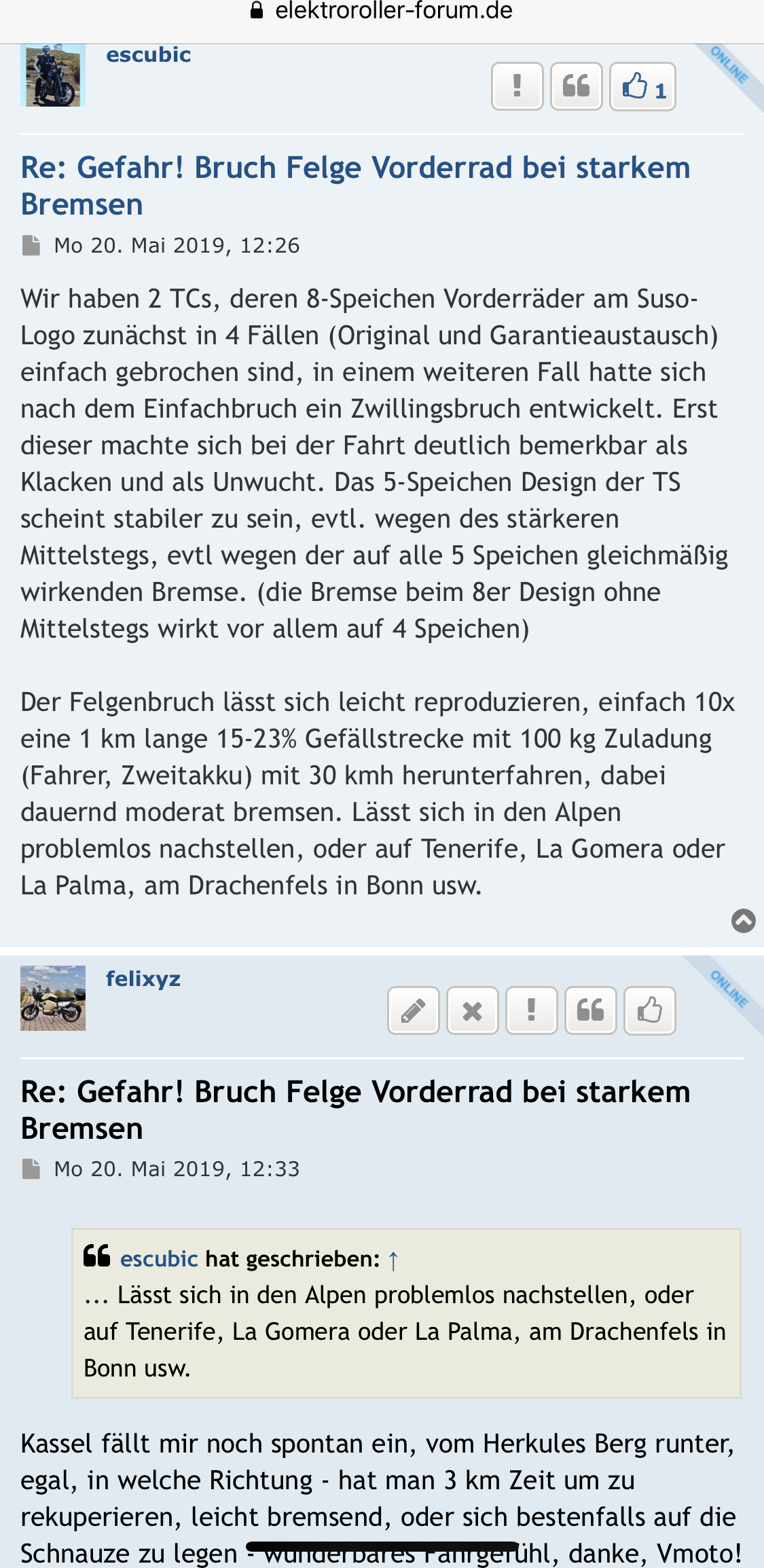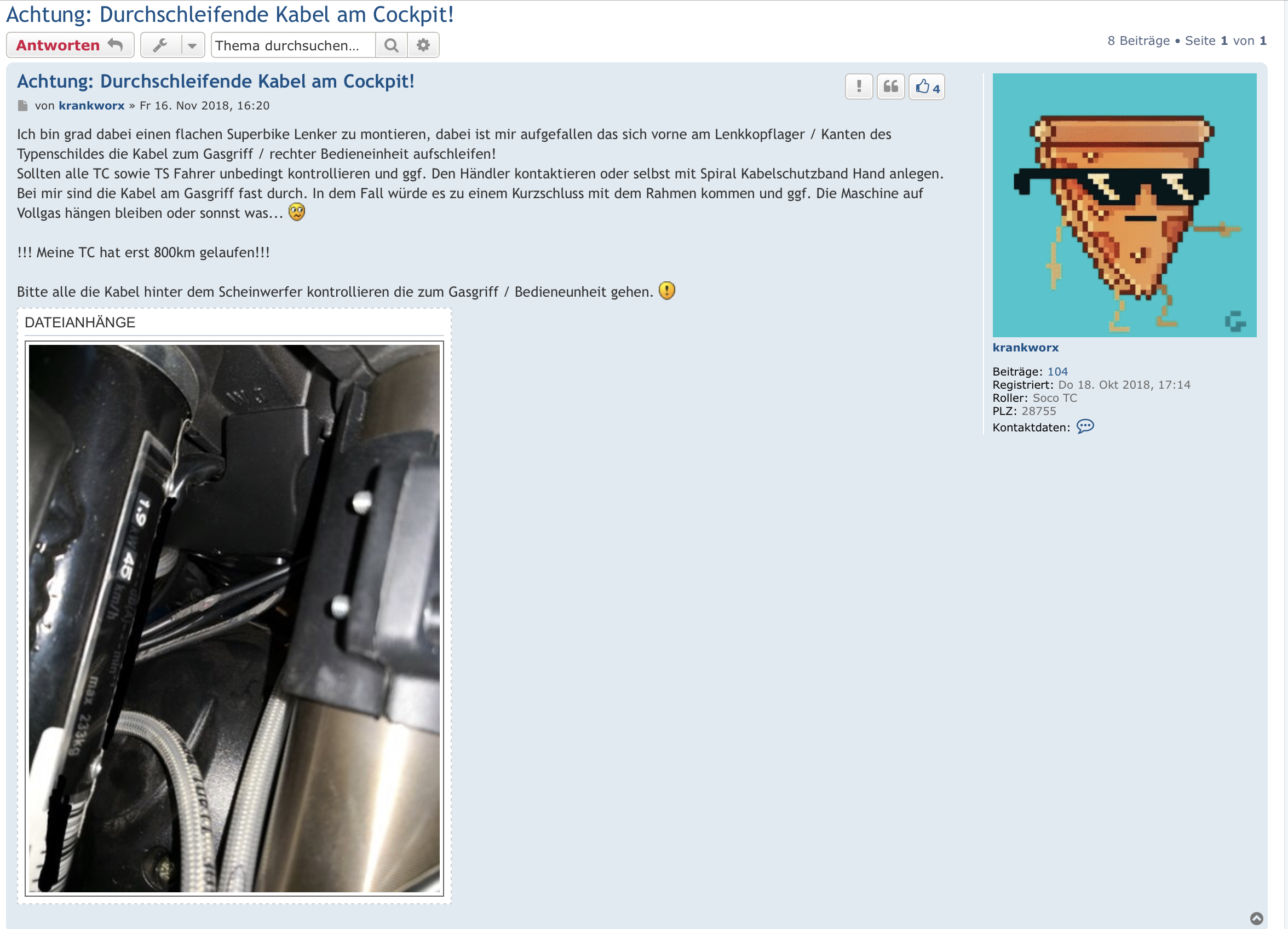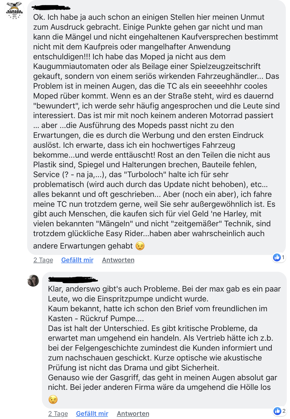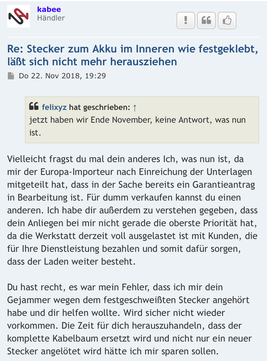 Nun möchte ich das Moped nicht unbedingt weiterverkaufen, ohne die Mängel vorher beseitigt zu haben, will keine Schuld auf mich laden, falls dem nächsten Besitzer aufgrund von bekannten Fehlern etwas passieren sollte. Außerdem fahre ich das Moped auch gerne weiter, sofern mir der Hersteller die hohe Qualität, wie in Prospekten beworben, zusichern kann bzw. die bekannten Mängel beseitigt.