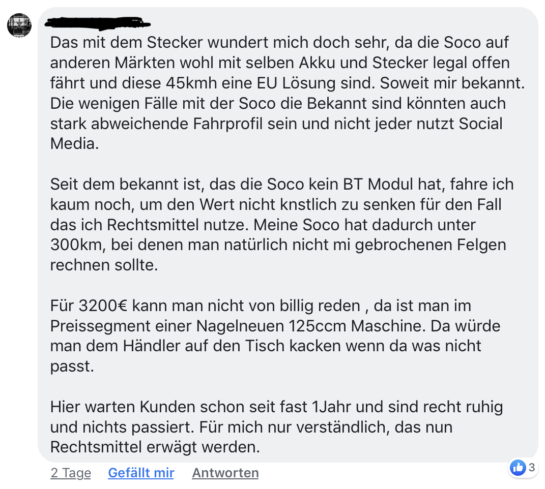 Ein weiterer Erfahrungsbericht aus der Super Soco Germany fb-Gruppe zum gleichen Thema:
