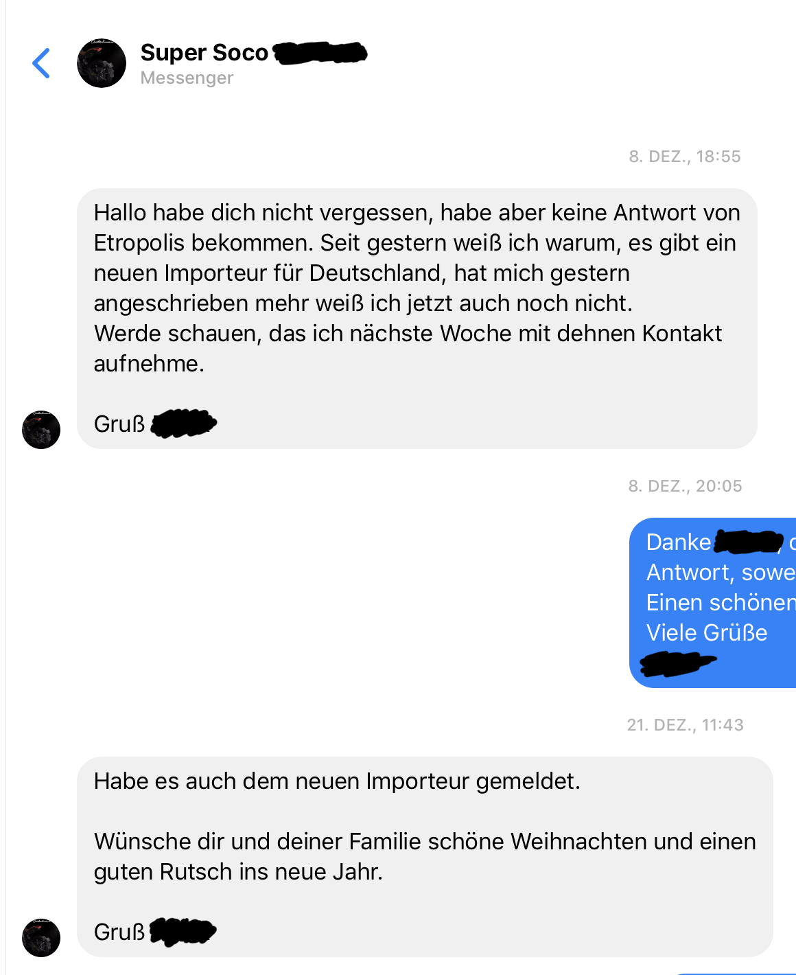 Ich konnte mit meiner TC nicht mehr zum Verkäufer, da er die Zusammenarbeit aufgrund von vielen Problemen am Tag der ersten Inspektion für die Zukunft abgesagt hat. So habe ich mich an 2 andere Super Soco Partner gewandt, beide haben freundlicherweise einen Antrag beim Importeur gestellt - einer hatte sofort Zeit, der andere erst 2 Monate später, deshalb wurde es beim 2ten abgelehnt. Der erste freundliche wartet bis heute noch...