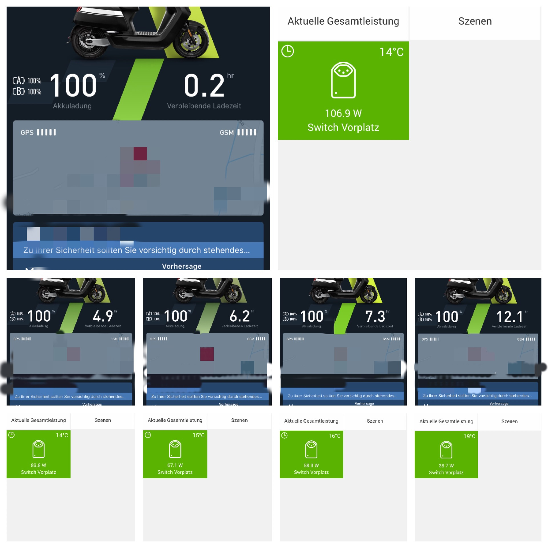 Ich hab das mal in einer Collage zusammengestellt. Man sieht immer die Anzeige der App und den gleichzeitigen Stromverbrauch: