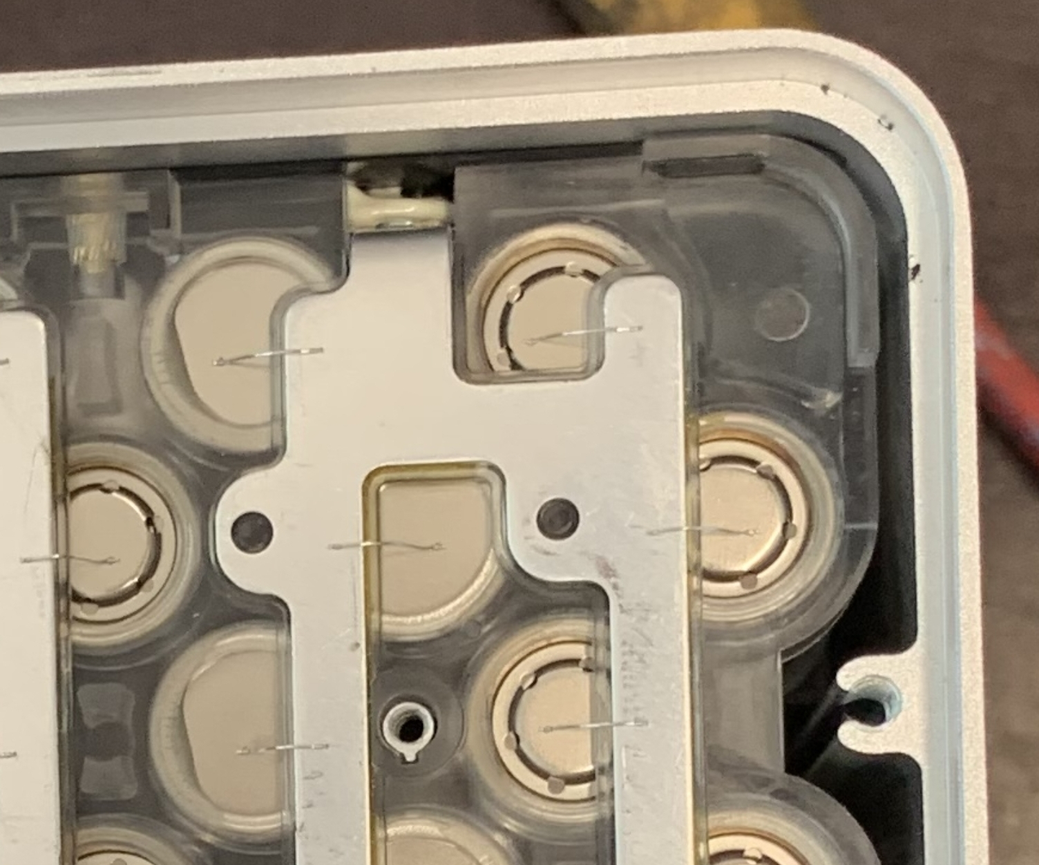Möglicherweise ist das eine Art von Feinsicherung. Die Zellen sind nicht direkt mit der Schiene verbunden, sondern nur über das Drähtchen. Eine 16A Feinsicherung ist nicht dicker wie das hier. Abgesehen davon ist mir aufgefallen, das die einzelnen Zellen am Plastik geklebt sind, was das zerlegen unmöglich macht.