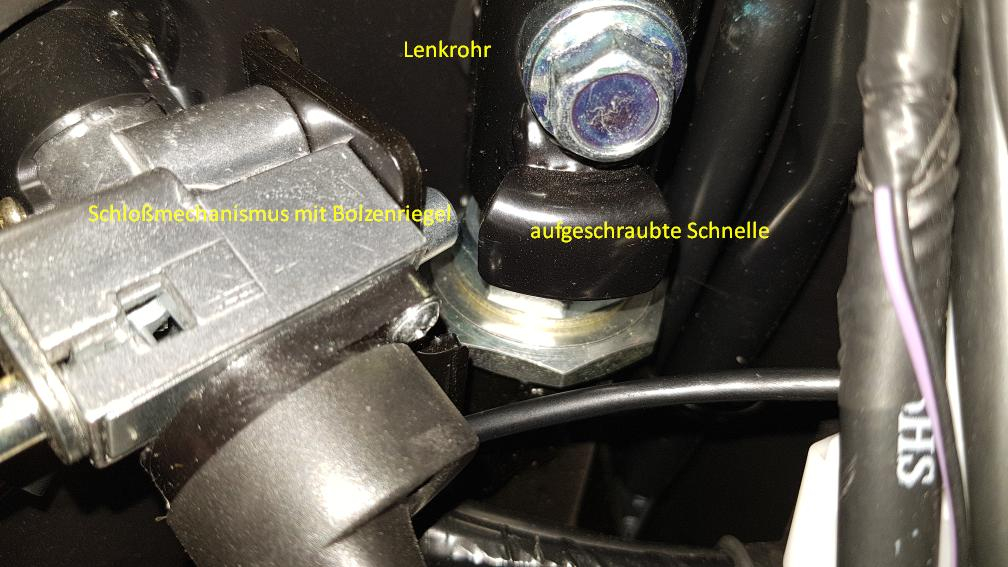 Da ich wegen der ECU die vordere Abdeckung ab hatte, habe ich mir die Lenkersperre mal angesehen.