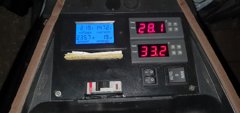 9. überarbeitung des "orig Batteriefach" mit Sicherungsautomaten, 230V Multimeter, 2x Temperaturrehelung (Controller Kühlen, Akku Heizen), Sicherung 12V, USB Buchse für Controller, 230V Schalter für jedes Ladegerät