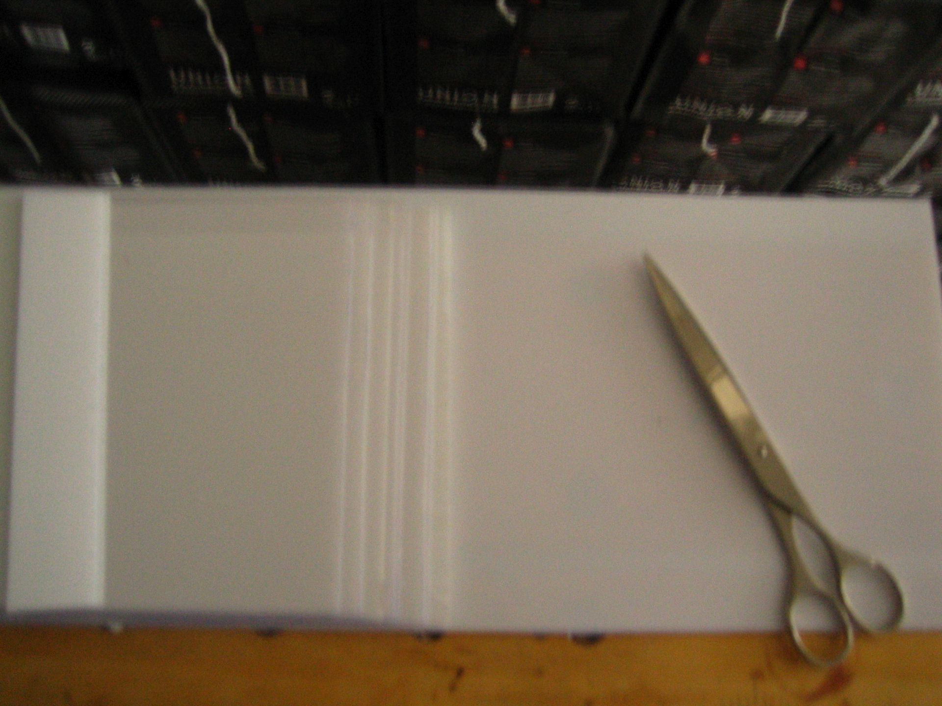 Die GTK Zellen bauen mit 36 * 130 * 195 (plus 5mm für die Pole) für 100Ah Zellen recht klein. Die Zellen stecken in 0,5mm starken Alugehäusen, welches mit blauer PVC Folie umwickelt ist. Von einem Pol zum Gehäuse mißt man 0,48V vom anderen sind es 2,8V. Ich habe mich daher entschlossen, die Zellen isoliert einzubauen, mit 0,75mm starken Plexiglas/Makrolon Stücken voneinander abzutrennen. Diese Stärke läßt sich noch mit einer größeren Papierschere schneiden: