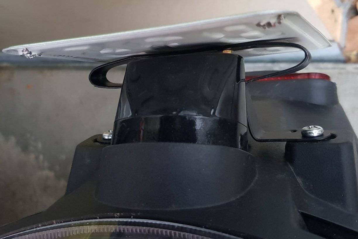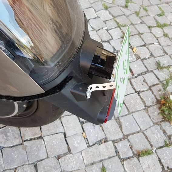 Nachdem durch den Gepäckträger die Winkellösung unter dem silbernen Haltegriff hinten wieder wegfiel, musste ich das spontan neu lösen (an einem Sonntagnachmittag unter Zeitdruck). Ich hatte eh die Idee, den ohnhin nicht erforderlichen Kennzeichenbeleuchter einfach zu überdecken: