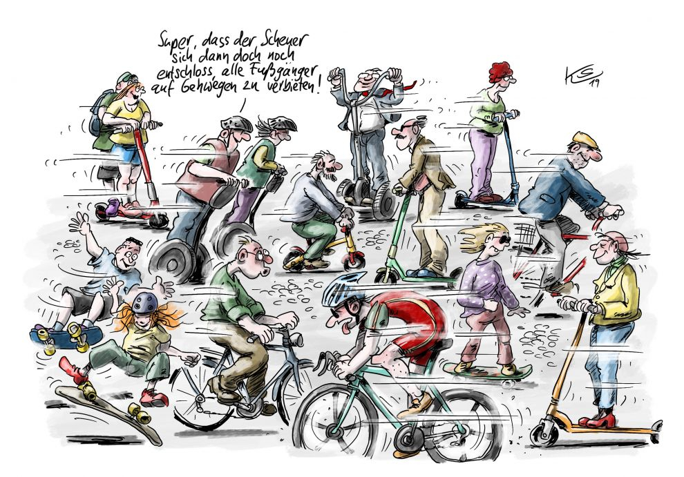 https://www.tagesspiegel.de/gesellschaf ... 05512.htmlE-Scooter dürften künftig nur noch auf der Straße oder auf Radwegen unterwegs sein. Bei Verstößen droht ein Bußgeld von 135 Euro. Damit solle dafür gesorgt werden, "dass Fußgänger nicht länger gegen Häuserwände gedrückt werden", sagte Borne. Ausgenommen sind lediglich Menschen, die ihren Roller mit abgeschaltetem Motor schieben. Die Regelung gilt auch für ähnliche Gefährte, etwa Segways und Monowheels.