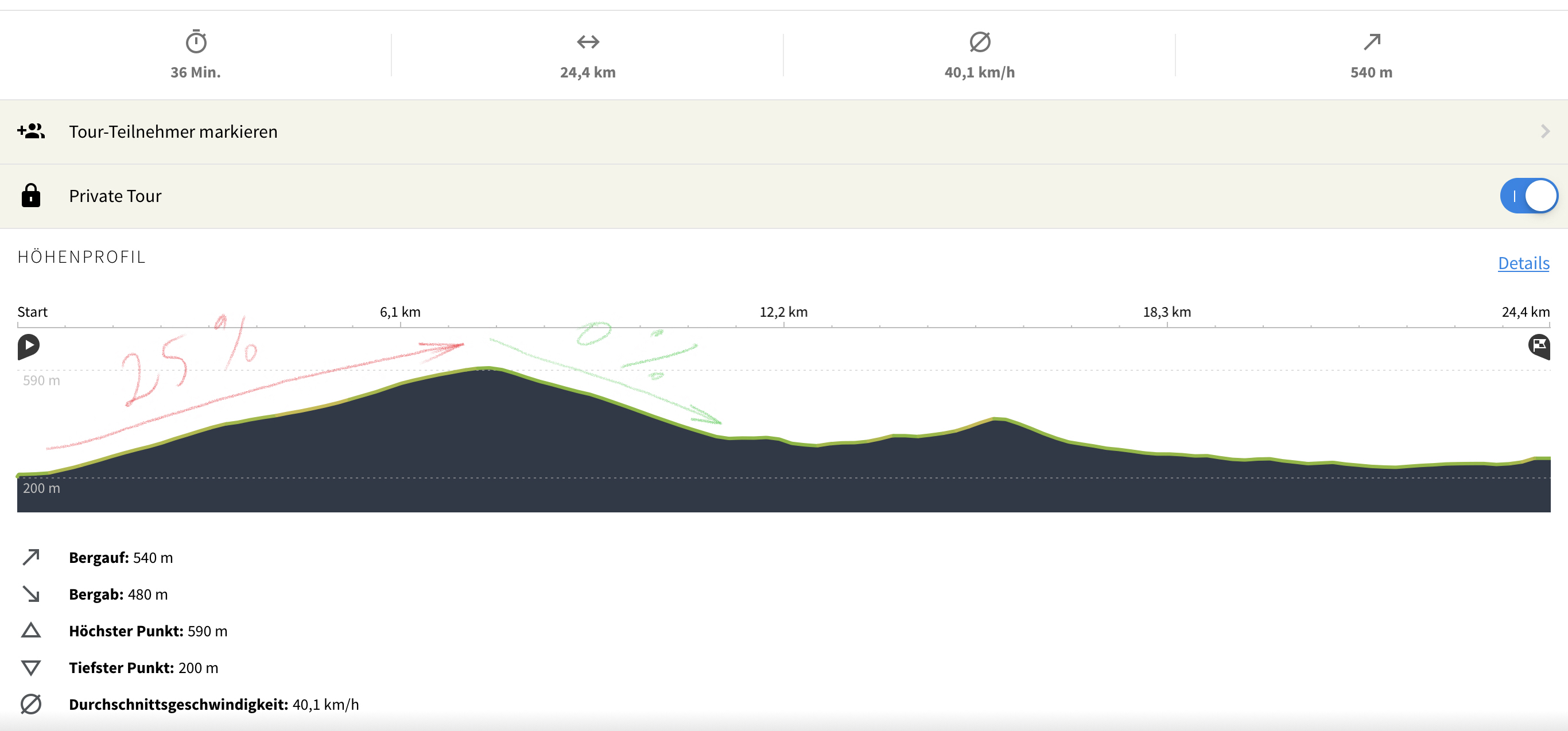 Aber selbst wenn: Du hast ja nicht sofort 80 Sachen drauf, sobald Du nach 7km über die Kuppe kommst, sondern musst sie Dir erst "errollen". Somit brauchst Du für die 5km also gut 5-6 Minuten. Dann bleiben für die übrigen 19,4km noch 30-31min "Netto-Fahrzeit", also ein Schnitt von 38-39km/h. Dabei geht lt. Grafik über die Hälfte (etwa 10km) bergauf - gedrosselt, nota bene… also wenn ich es wäre, würd ich diesen Eid jeden Morgen vor dem Spiegel üben. 8-) Nix für ungut! (Außerdem war ich immer nur gut in Mathe, nicht in Physik, also hab ich bestimmt nen physikalischen Denkfehler.)