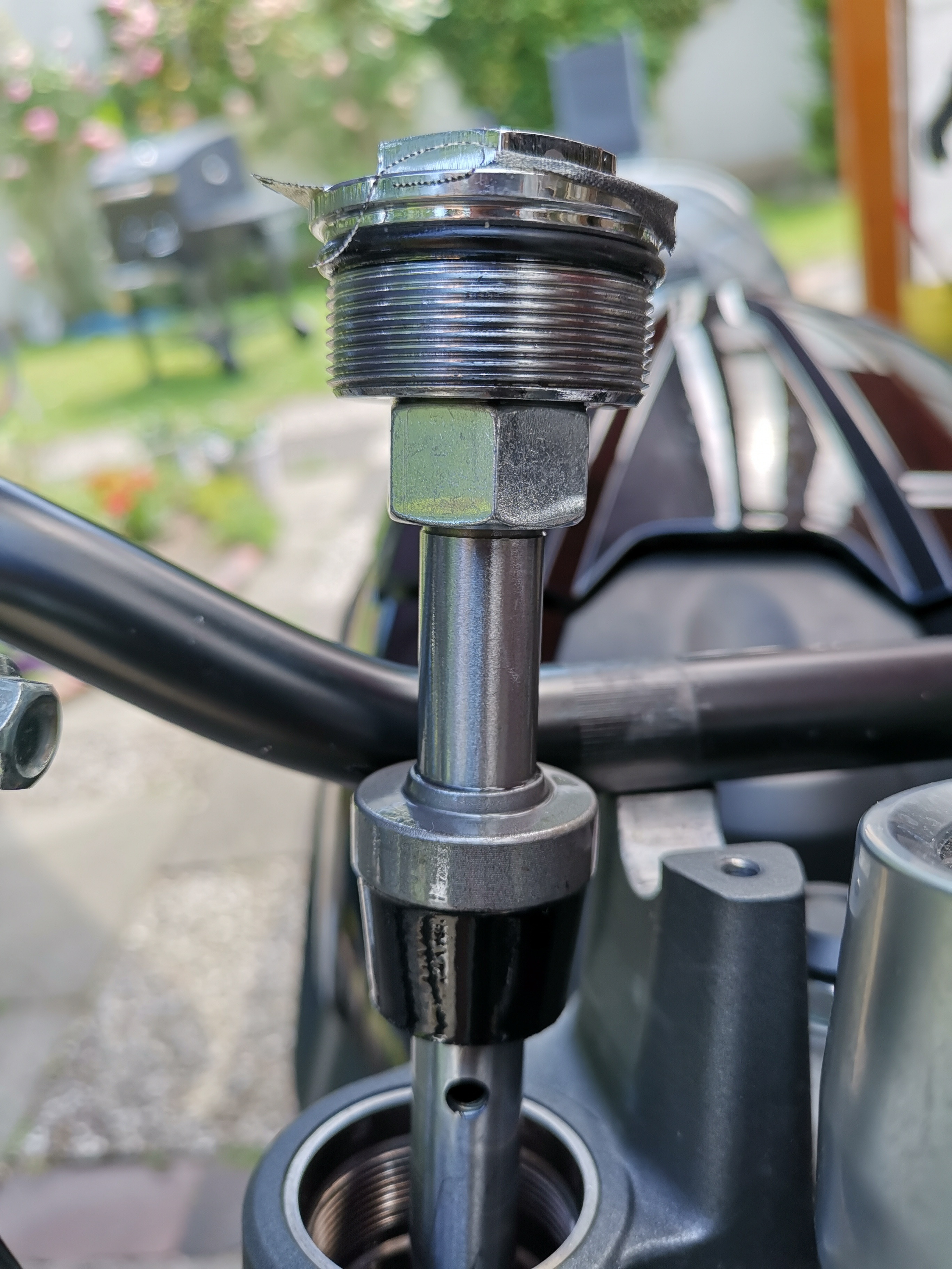 In der Kappe oben greift die Dämpfer Kartusche und ist über eine Mutter gegen gekontert. Hier kamm man knapp ein cm raus holen. Macht sicher nicht den gehofften unterschied, aber bin unmotiviert für Gabel zu zerlegen :D