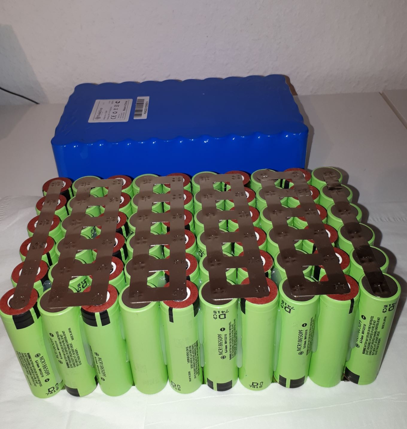 Die haben jeweils 36Volt in 10s6p-Konfiguration und enthalten Panasonic NCR18650PF-Zellen (3,6 V, 2.900mAh): Im Vordergrund ist ein Pack ausgepackt zu sehen. Zwei Pakete in Reihe (20s) wären eigentlich 72 Volt, 17,4Ah. Ich habe für meinen 60V-Roller jetzt zwei Paralelreihen abgeklemmt (Reserve für Bordstrom), um nur mit 65V (18s) in den Controller zu gehen, da mein 60V-Innoscooter auch mit 64V-LiFePO4 betrieben wird. Da die Packs schon punktverschweißt sind, war meine Vorstellung selbst wenig an der Kontaktierung arbeiten zu müssen.