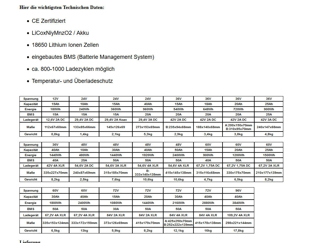 Also, da ich von Akkus keine allzugroße Ahnung habe, aber ein günstiger Ersatzakku uns wohl alle etwas "beruhigen" würde, hab ich mal den Besitzer von akkushop-24 angeschrieben und die Daten vom Super Soco durchgegeben. Im Anhang habe ich Euch mal die Auflistung seiner Akkus beigefügt, liest sich eigentlich recht gut......leider kam gerade die Antwort, dass er für so starke Motoren derzeit keine Akkus anbietet, hmm. Wo liegt mein Denkfehler? Ist es die Wattleistung mit 2800? Denke bzw sehe, dass es hier doch einige Fachleute gibt, die es mir erklären würde, dann kann man weitersuchen!!!