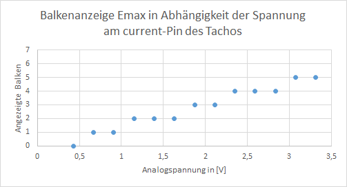 -> Gibt man 5V auf den Pin, dann zeigt der Tacho alle 6 Balken an. Bei 1,6V sind es zwei Striche (habe ich mit einer Batterie getestet)