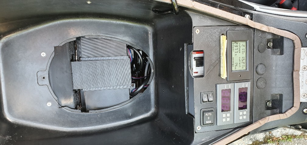 9. überarbeitung des "orig Batteriefach" mit Sicherungsautomaten, 230V Multimeter, 2x Temperaturrehelung (Controller Kühlen, Akku Heizen), Sicherung 12V, USB Buchse für Controller, 230V Schalter für jedes Ladegerät