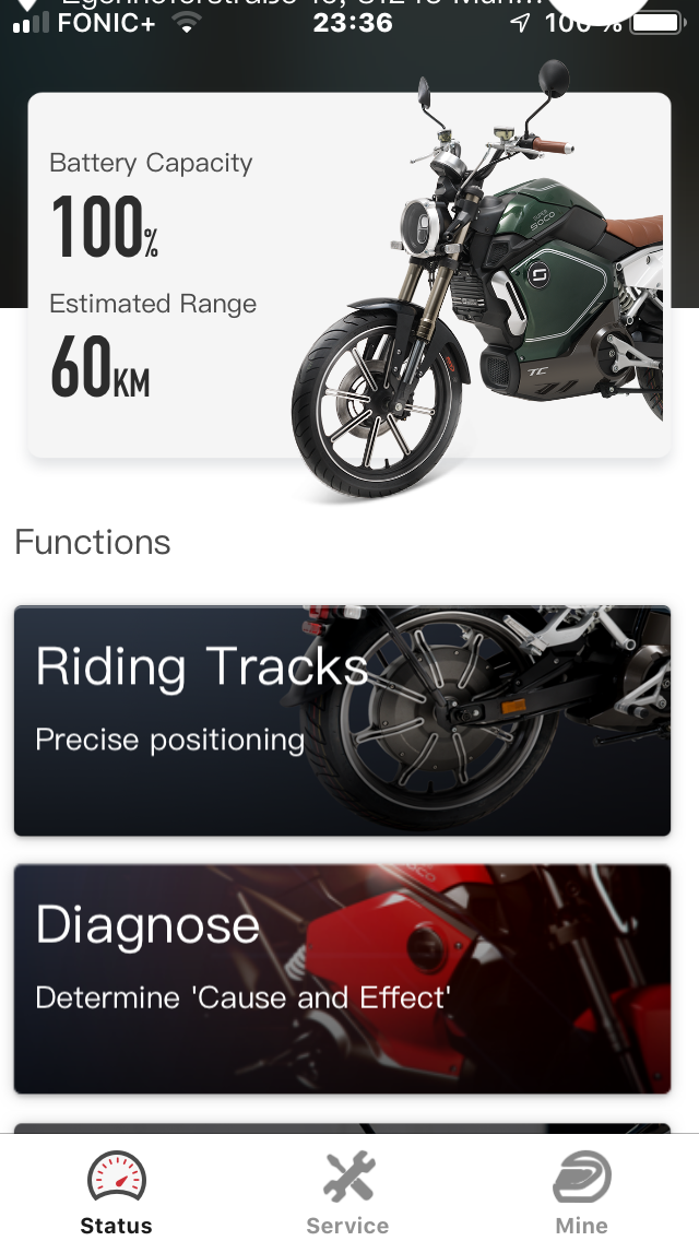 Meine TC hat von Anfang an nur das GPS Modul. Ist bereits von leeb ( https://supersoco-motor.com/tc ). Zu Beginn hat nur GPS und Benachrichtigung wie „unusual vibration“ funktioniert. Vor kurzem hab ich mir die Mühe gemacht eine technische Problembeschreibung an den Soco support zu schicken. Ob das jetzt ursächlich war kann ich nicht sagen - aber seit ein paar Tagen funktioniert die App komplett. Mobilempfang vorausgesetzt... Also Anzeige von Position, Akkustand, Reichweite, Riding Tracks und Diagnose.