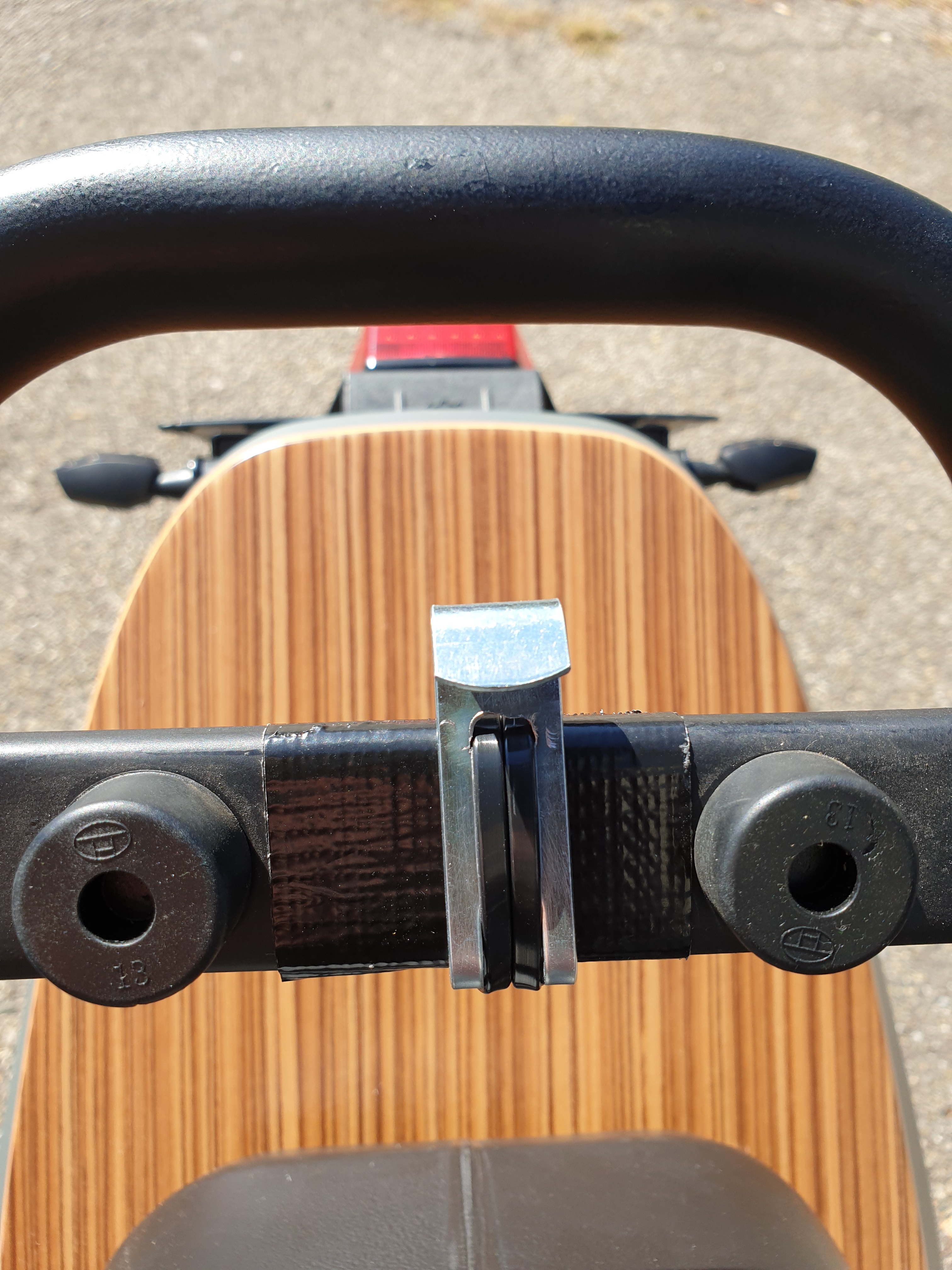 Daher habe ich einen Haken unter dem Sitz angebracht, an dem der Helm sicher und "regenfest" fest gemacht werden kann.