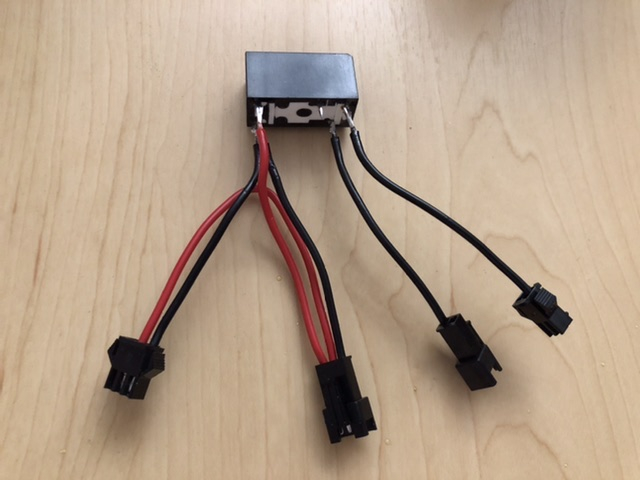 Am linken Anschluss wird die Vorderlampe angesteckt. Der zweite 3-pol.-Stecker wird mit dem Controller verbunden. Dort mit dem 3-pol. Grün-Rot-Schwarz, an dem original das Vorderlicht dran war.